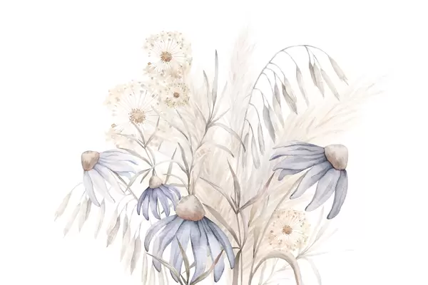 Valokuvatapetti Voikukkia ja kukkia kuivien yrttien joukossa Nr w03908