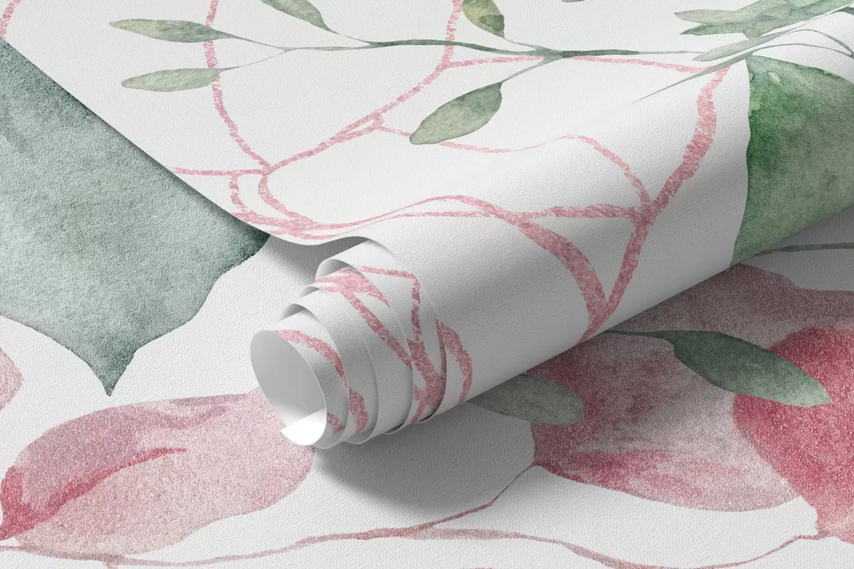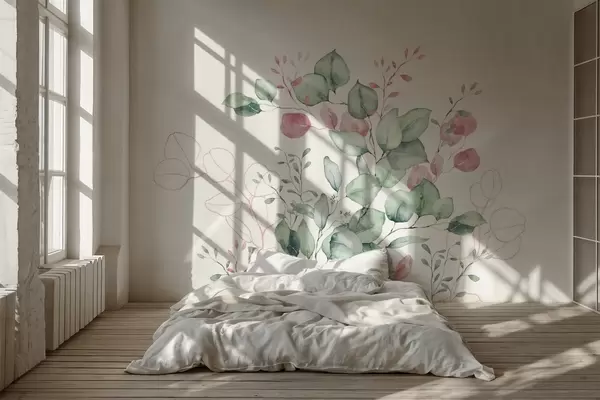 Valokuvatapetti Kasvillisuus ja oksat jäljitelmä kuvioitu akvarelli, vihreän ja vaaleanpunaisen sävyjä Nr w03927v2
