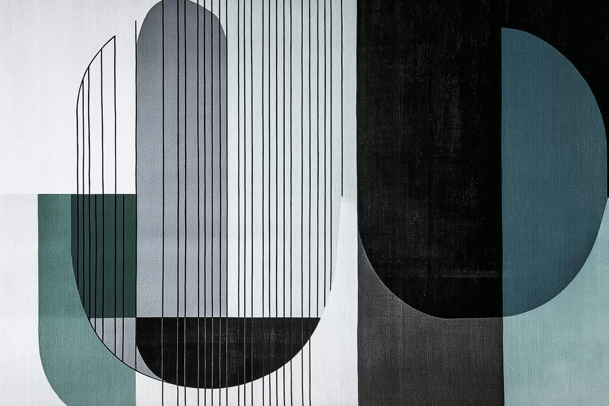 Valokuvatapetti moderni abstrakti geometrinen sommitelma, jossa on päällekkäisiä muotoja ja pystysuoria viivakuvioita, ohuita viivoja, jotka täyttävät puolisuunnikkaat ja soikiot, pehmeä tekstiilitekstiili, lämpimät mykistetyt sävyt, kuten oliivinvihreä, taupe, beige ja hiili, hienovarainen läpinäkyvyystehoste muotojen välillä Nr w03937v2