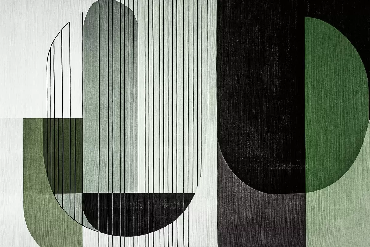 Valokuvatapetti moderni abstrakti geometrinen sommitelma, jossa on päällekkäisiä muotoja ja pystysuoria viivakuvioita, ohuita viivoja, jotka täyttävät puolisuunnikkaat ja soikiot, pehmeä tekstiilitekstiili, lämpimät mykistetyt sävyt, kuten oliivinvihreä, taupe, beige ja hiili, hienovarainen läpinäkyvyystehoste muotojen välillä Nr w03937v3