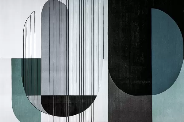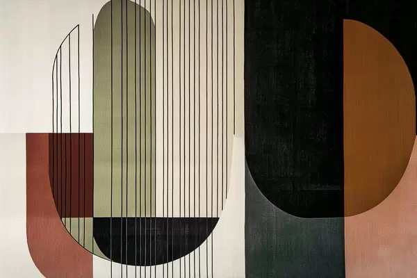 Valokuvatapetti moderni abstrakti geometrinen sommitelma, jossa on päällekkäisiä muotoja ja pystysuoria viivakuvioita, ohuita viivoja, jotka täyttävät puolisuunnikkaat ja soikiot, pehmeä tekstiilitekstiili, lämpimät mykistetyt sävyt, kuten oliivinvihreä, taupe, beige ja hiili, hienovarainen läpinäkyvyystehoste muotojen välillä Nr w03937v4