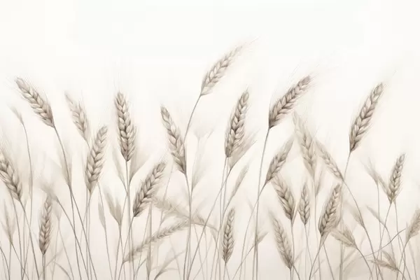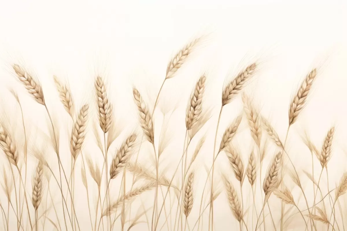 Valokuvatapetti herkkä kasvitieteellinen kuvitus vehnänvarsien varret, käsin piirretty tyyli, hienoja viivoja pastelli liitu rakenne, pehmeä seepia ja maanläheinen ruskea sävyjä, valkoinen tausta, symmetrinen tyylikäs koostumus, luonnollinen luonnos estetiikka Nr w03943