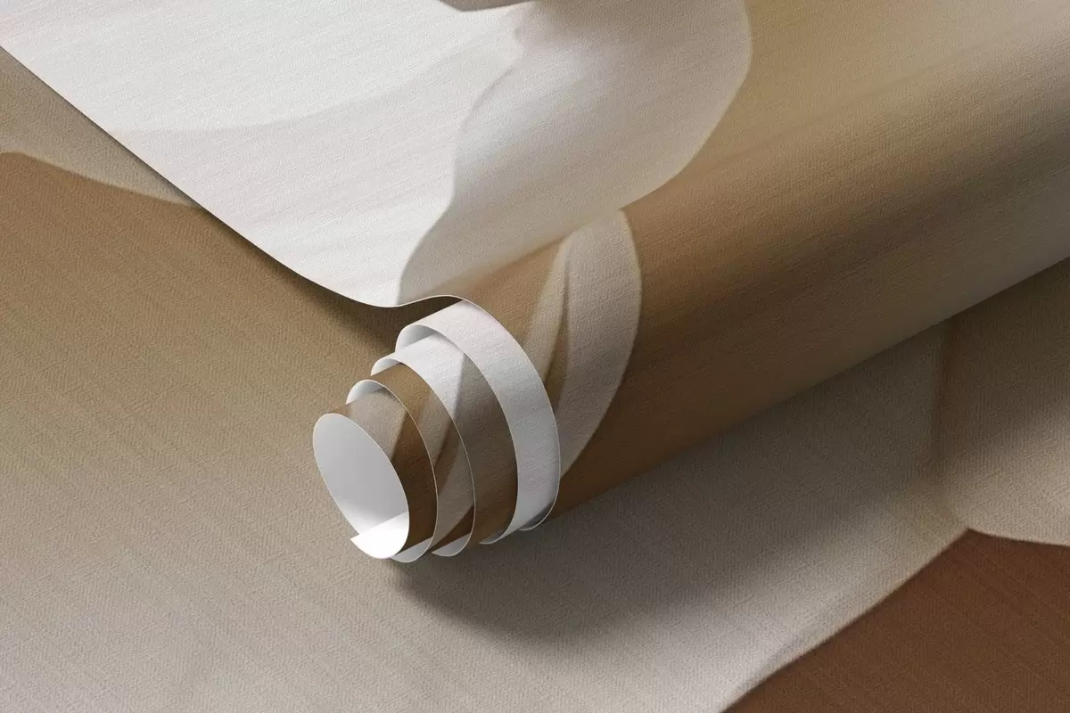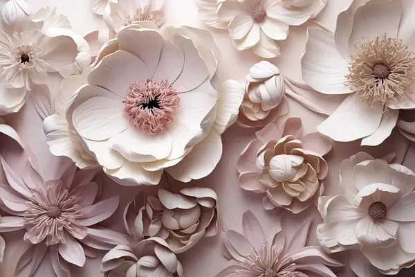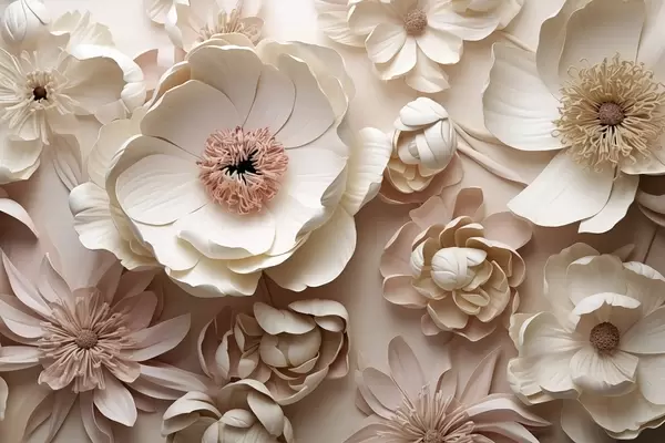 Valokuvatapetti Volumetrinen kukka-asetelma, jossa on herkkiä paperin tai tekstiilin kaltaisia terälehtiä norsunluun, vaniljan ja punertavan sävyissä, lämpimän beigen kankaan alla. Nr w03945