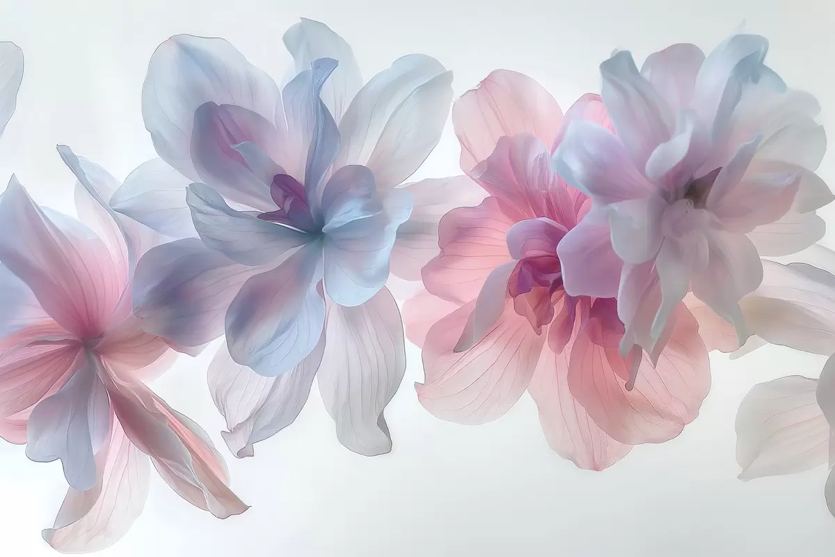 Valokuvatapetti hyperrealistiset pastelliväriset kukat leijuvat valkoisessa tilassa, herkät terälehdet, eteerinen valaistus, yksityiskohtainen kasvitieteellinen taide, Nr w03946