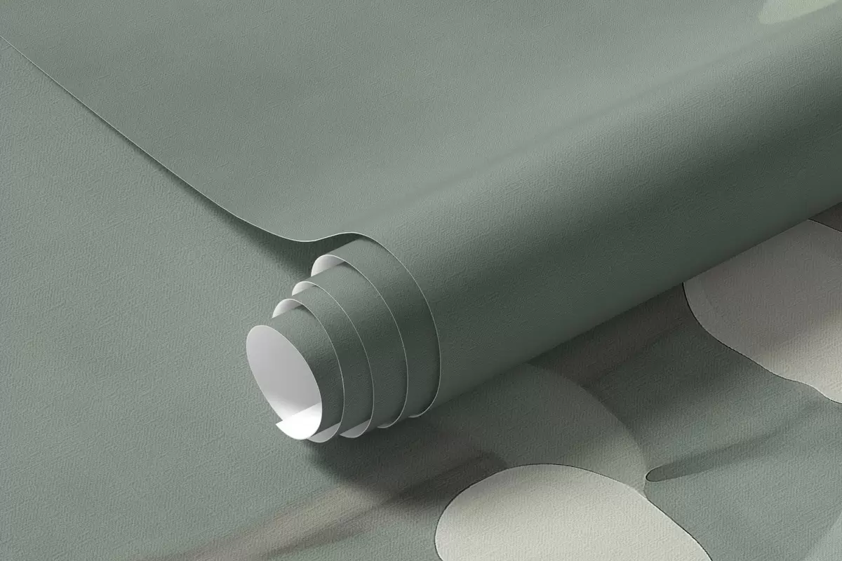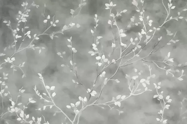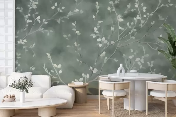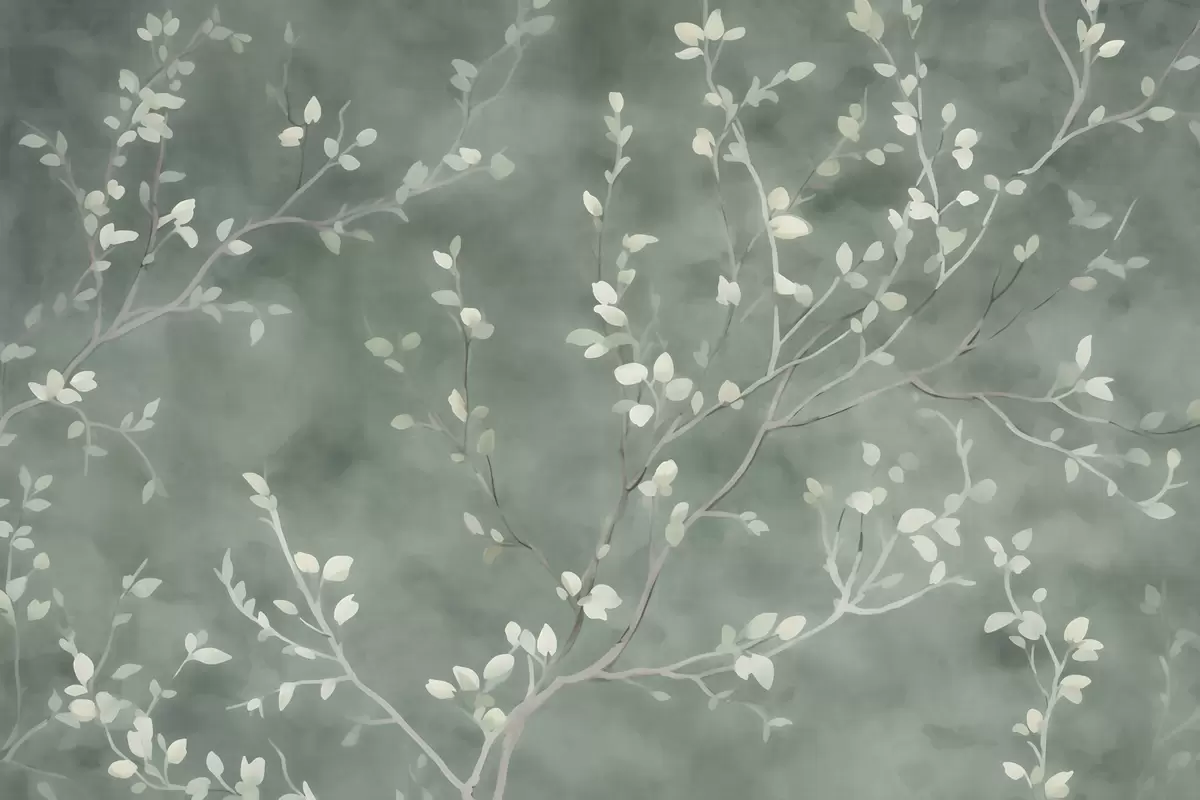Valokuvatapetti minimalistinen käsinmaalattu taustakuvio pehmeistä valkoisista puun oksista, joissa on herkät lehdet, jotka haarautuvat orgaanisesti vaimean salvianvihreällä taustalla, hieno kasvitieteellinen viivoitus luonnollisessa virtauksessa Nr w03949