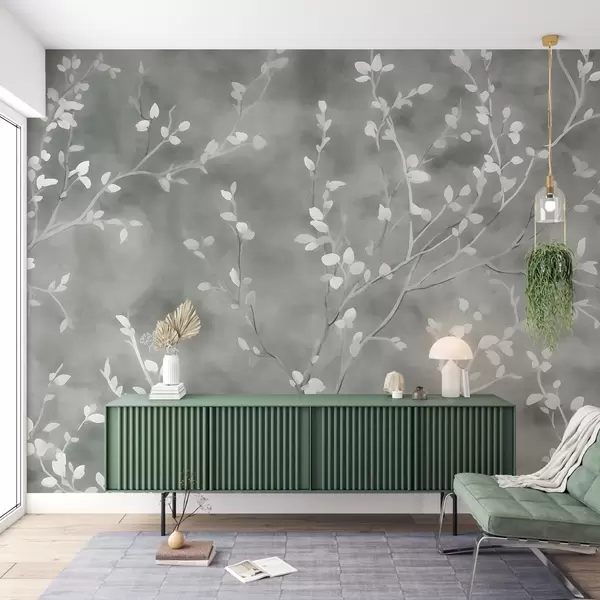 Valokuvatapetti minimalistinen käsinmaalattu taustakuvio pehmeistä valkoisista puun oksista, joissa on herkät lehdet, jotka haarautuvat orgaanisesti vaimean salvianvihreällä taustalla, hieno kasvitieteellinen viivoitus luonnollisessa virtauksessa Nr w03949v2