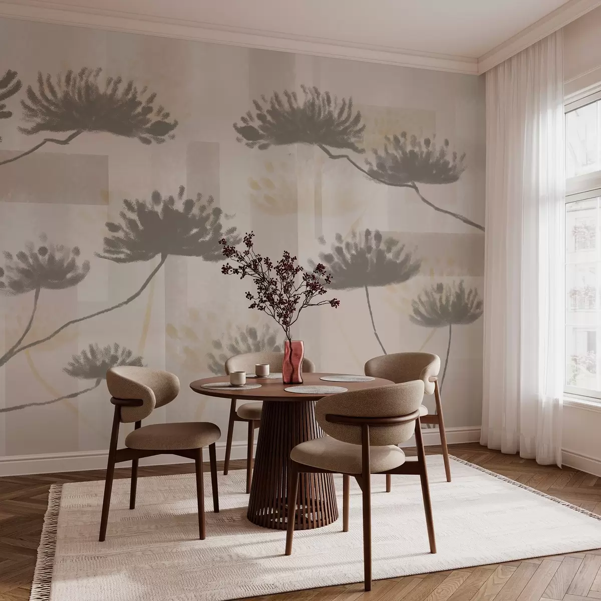 Valokuvatapetti kuvioitu geometria beigen ja kerman sävyissä, joissa on tyyliteltyjä sateenvarjokukkia w03960