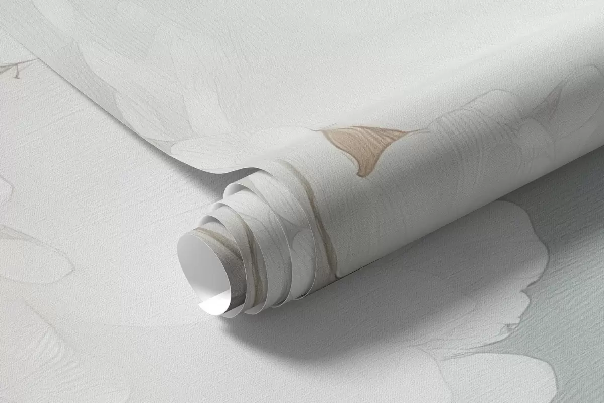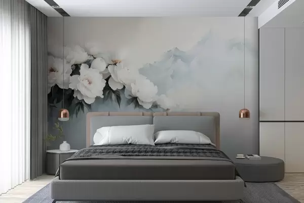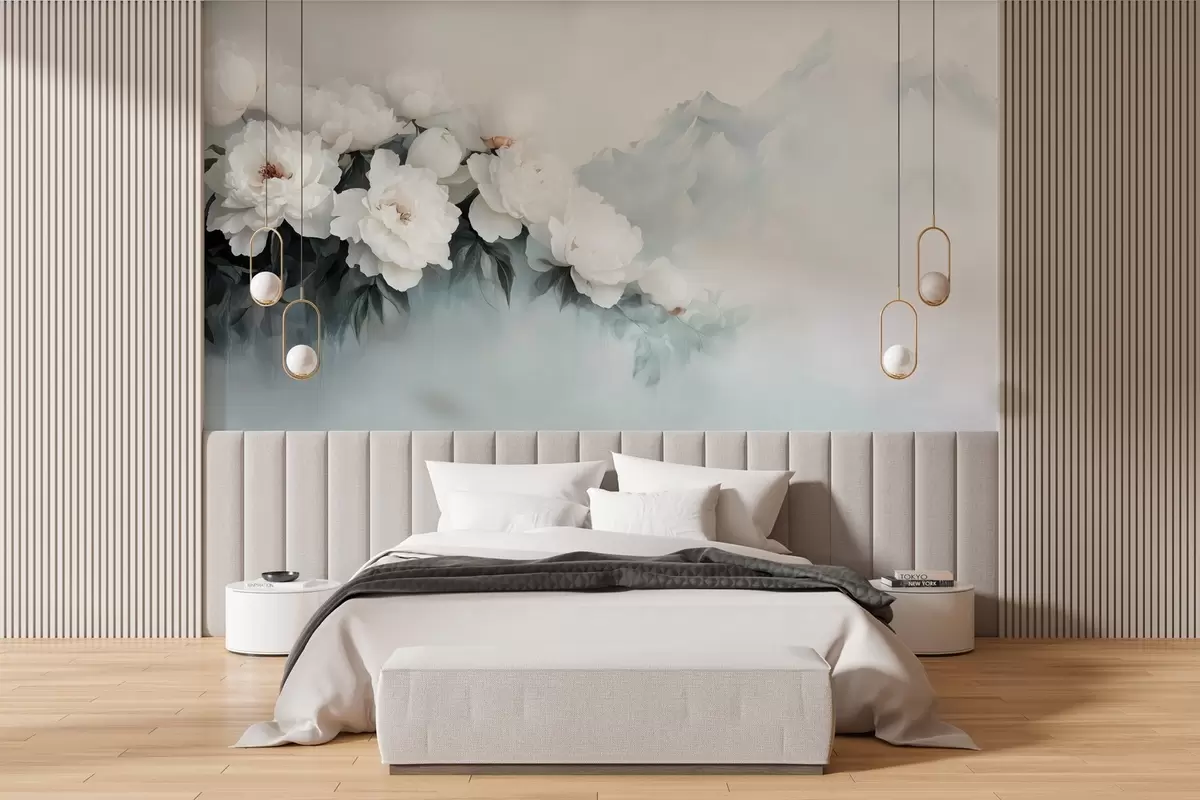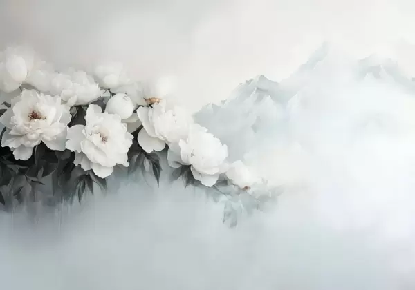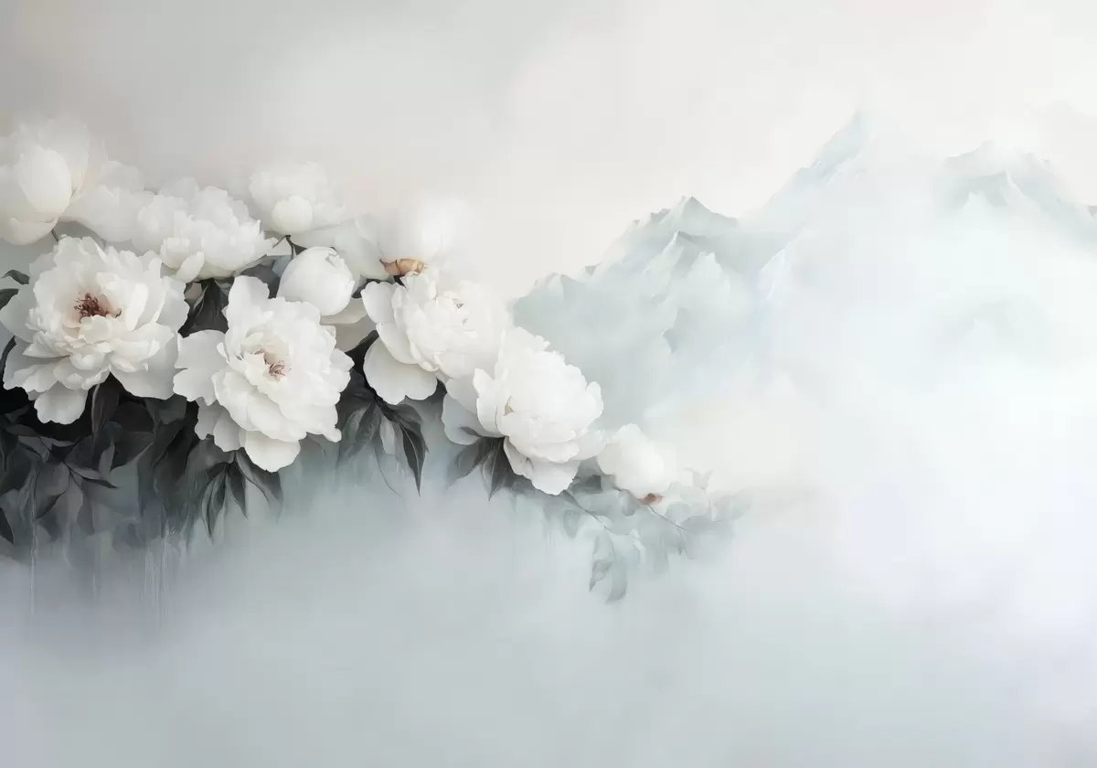 Valokuvatapetti maalaukselliset rehevät valkoiset pionit sumuisten vuorten taustaa vasten Nr w03965