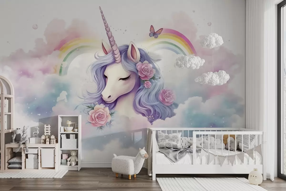 Valokuvatapetti Pastellivärinen yksisarvinen pilvissä, sateenkaari ja ruusuja Nr w03990