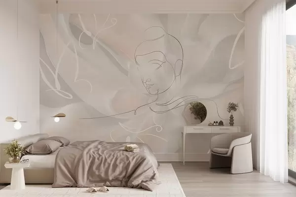 Valokuvatapetti Floral abstraktio Buddha viiva piirustus, beige värit Nr w04004