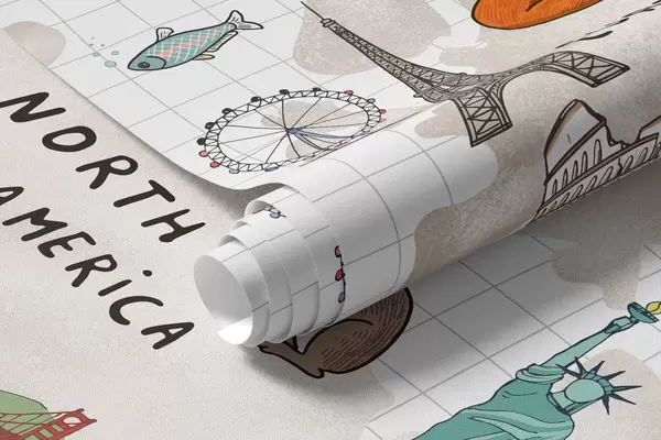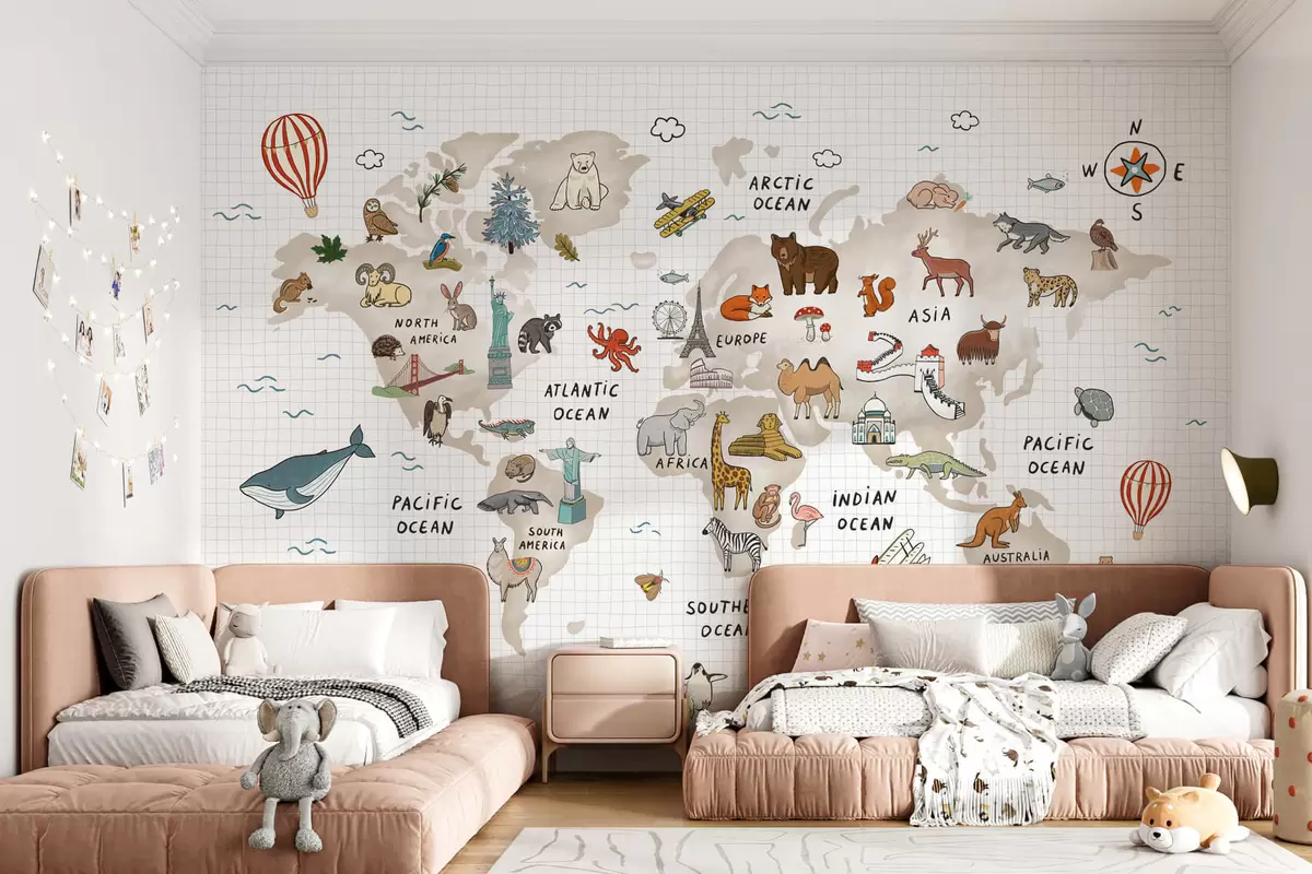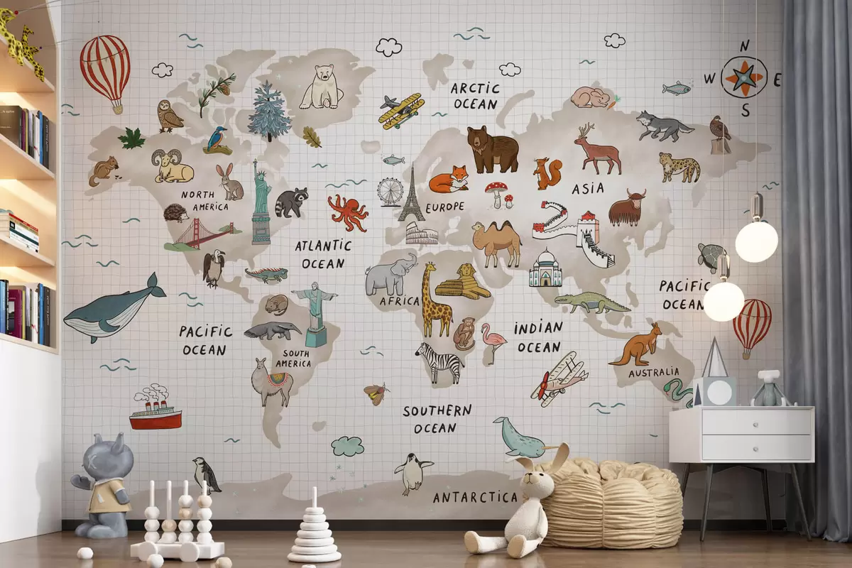 Valokuvatapetti Maailman kartta, jossa on eläimiä ja maamerkkejä Nr w04011