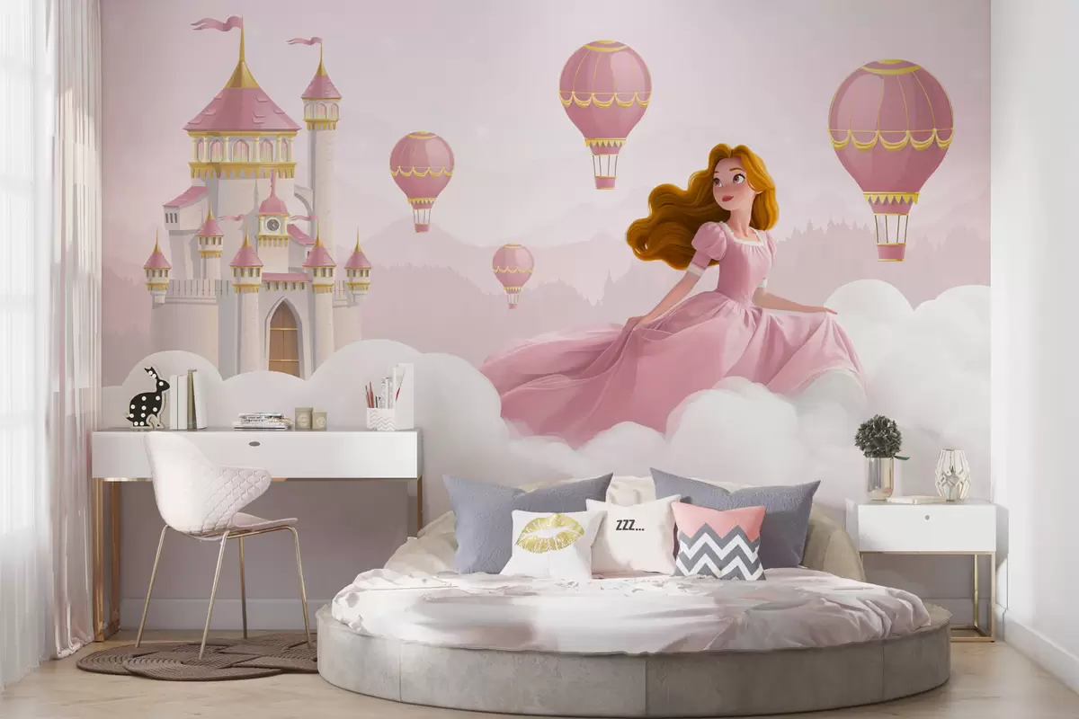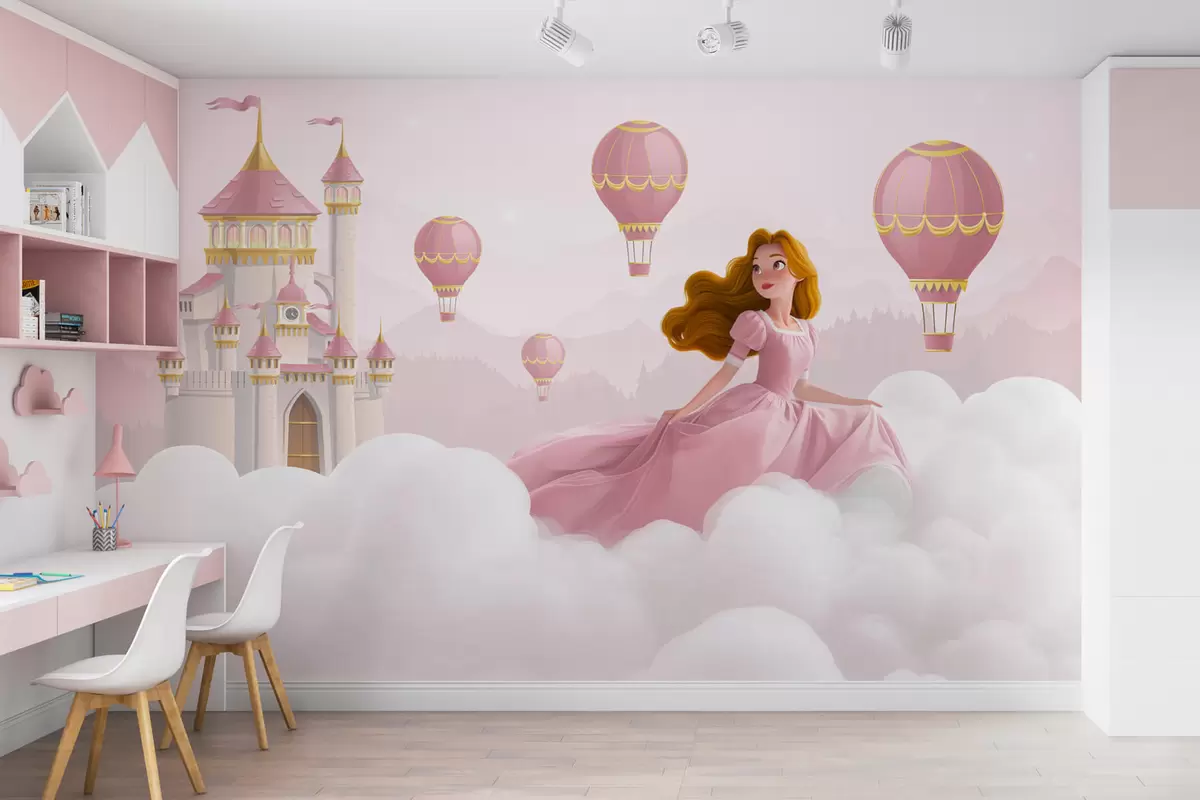 Valokuvatapetti Prinsessa keskellä pilviä taustalla maisema ja linna Nr w04015v1