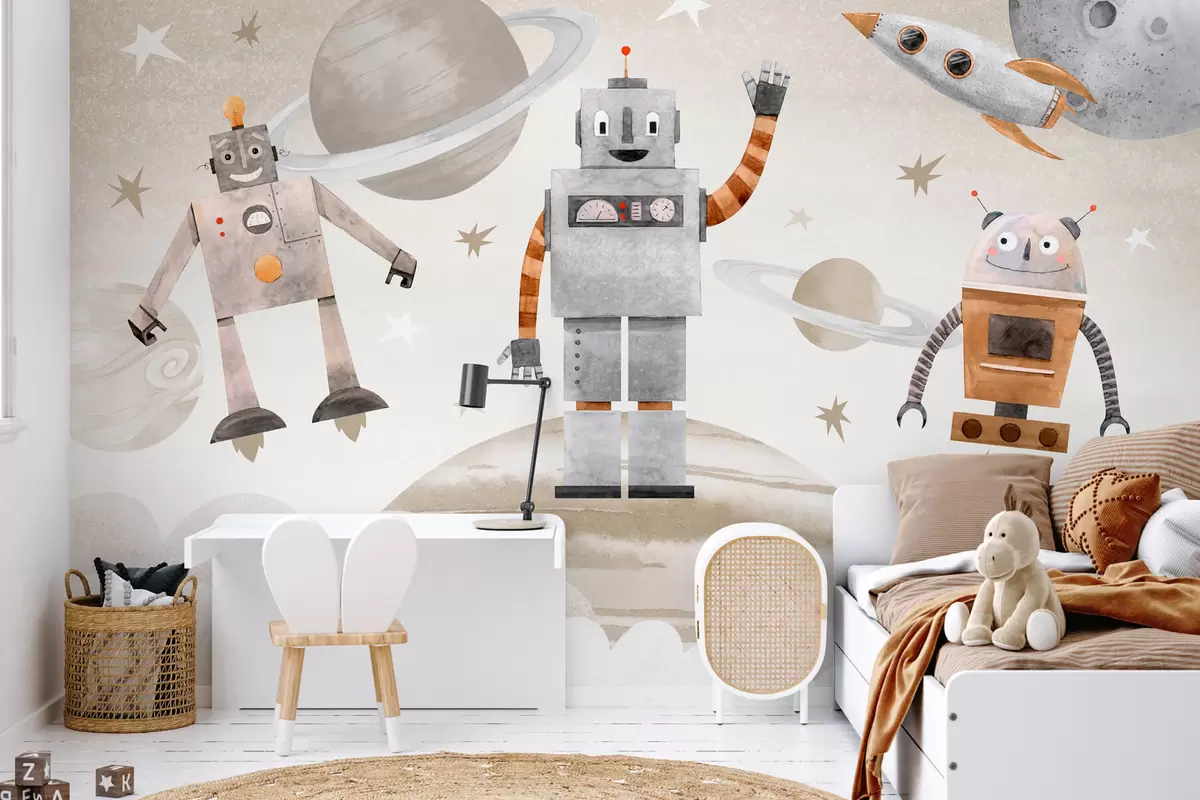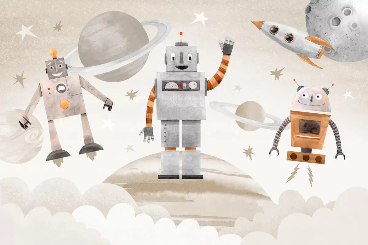 Valokuvatapetti Robotit avaruudessa vesivärityyliin Nr w04016v1