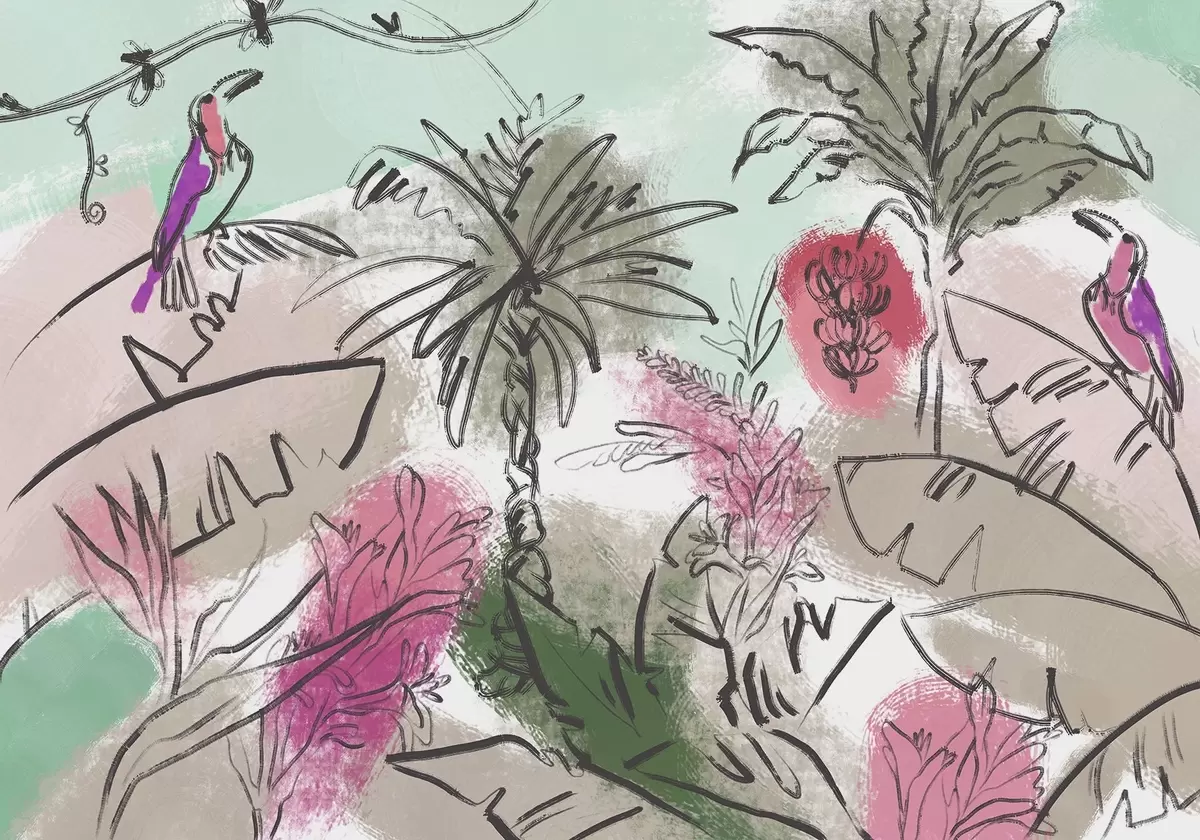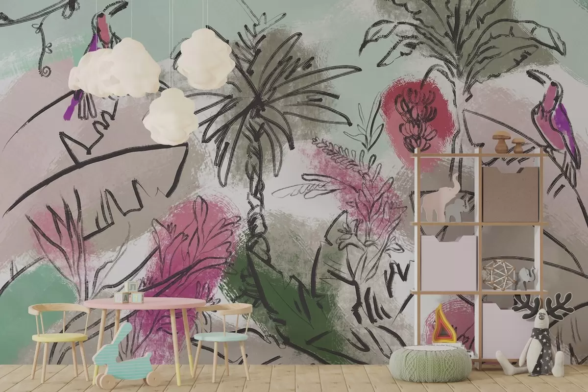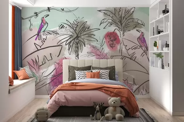 Valokuvatapetti Trooppinen printti vaaleanpunaisilla kukilla, eksoottisilla papukaijoilla Nr w04019v1