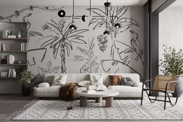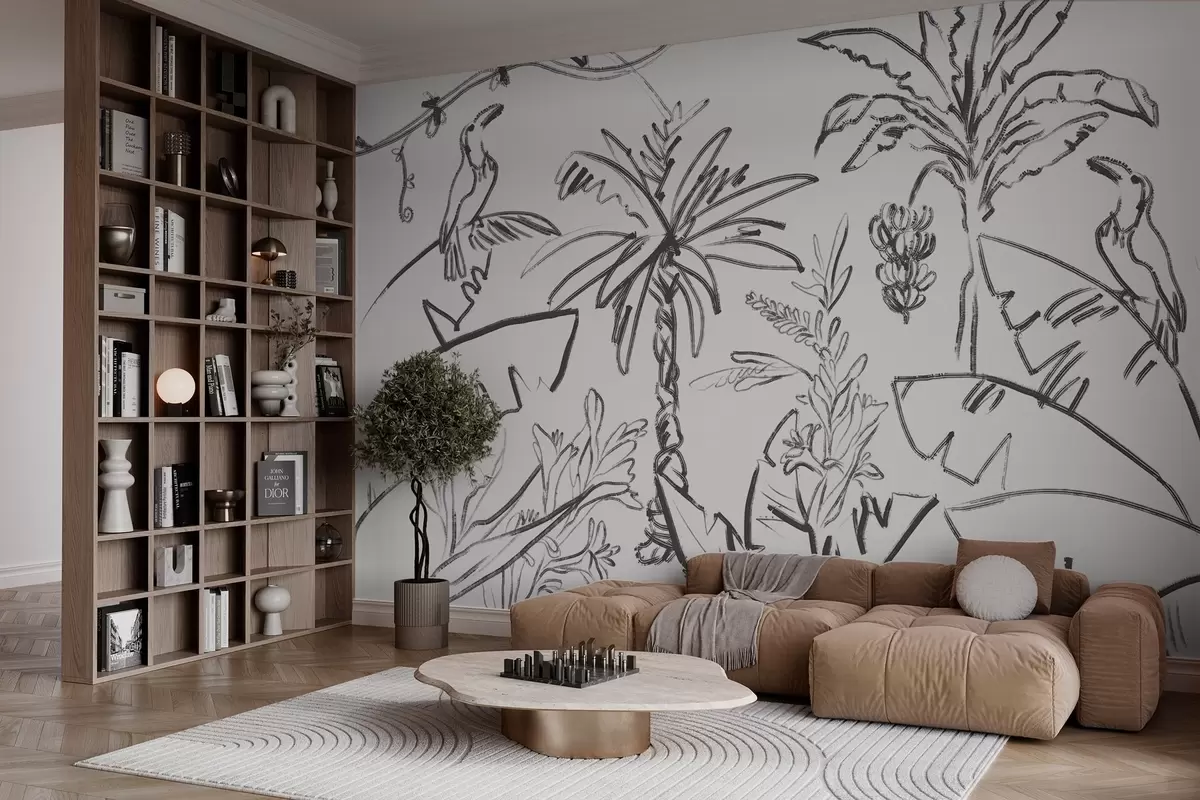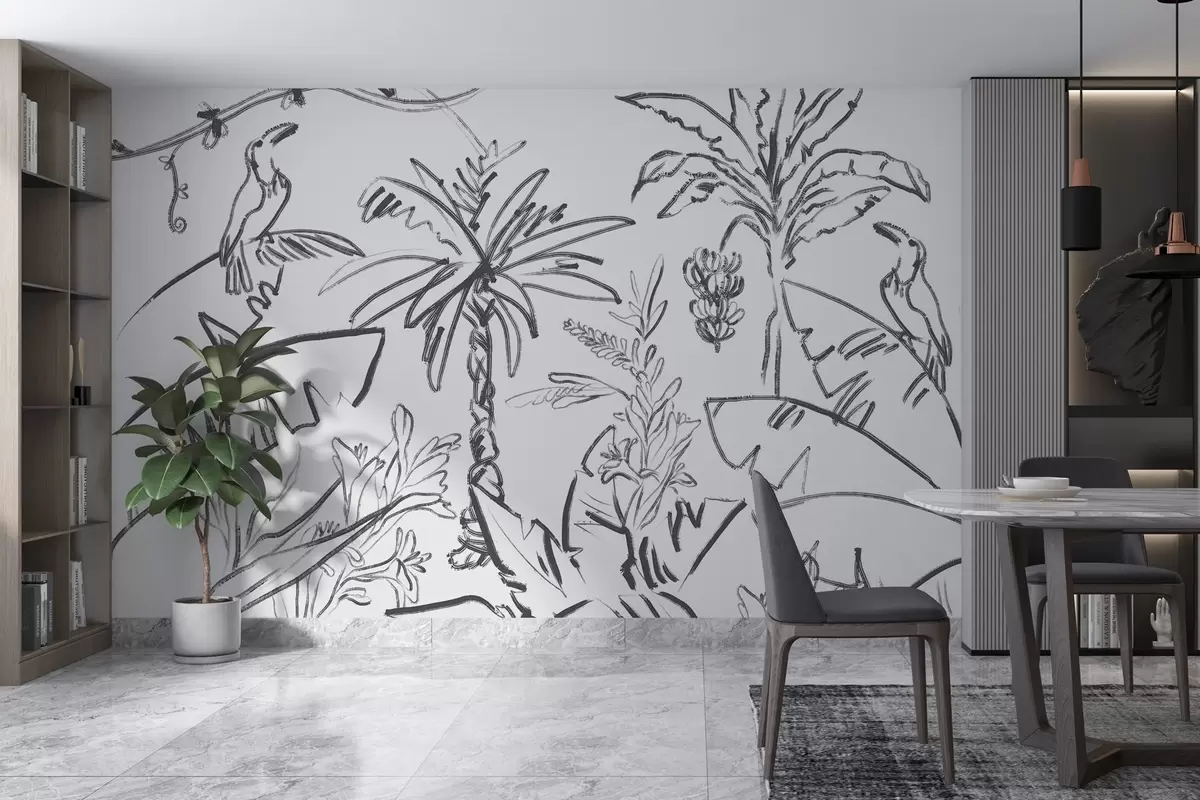 Valokuvatapetti Trooppinen viivapiirros, banaanit, palmupuut, ääriviivagrafiikka Nr w04020