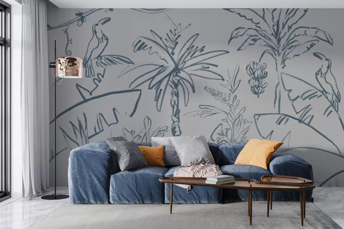 Valokuvatapetti Trooppinen kuvio sinisellä, banaaneja, palmuja Nr w04020v1