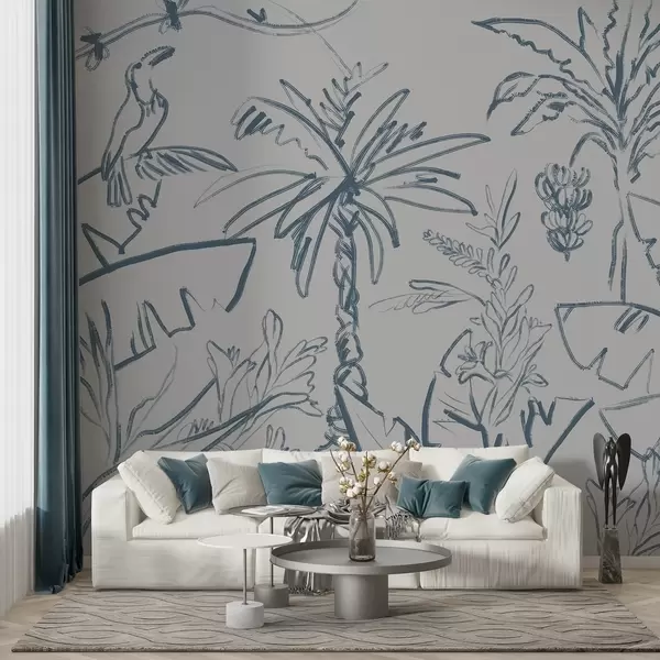 Valokuvatapetti Trooppinen kuvio sinisellä, banaaneja, palmuja Nr w04020v1