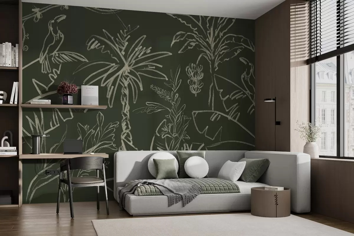 Valokuvatapetti Trooppinen kuvio tummanvihreällä taustalla, palmuja, banaaneja w04020v5
