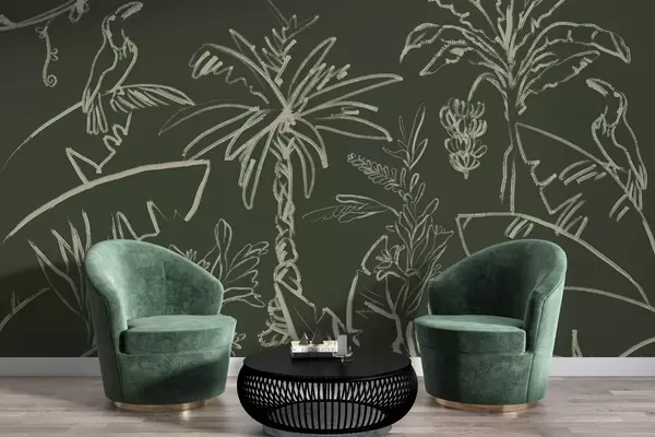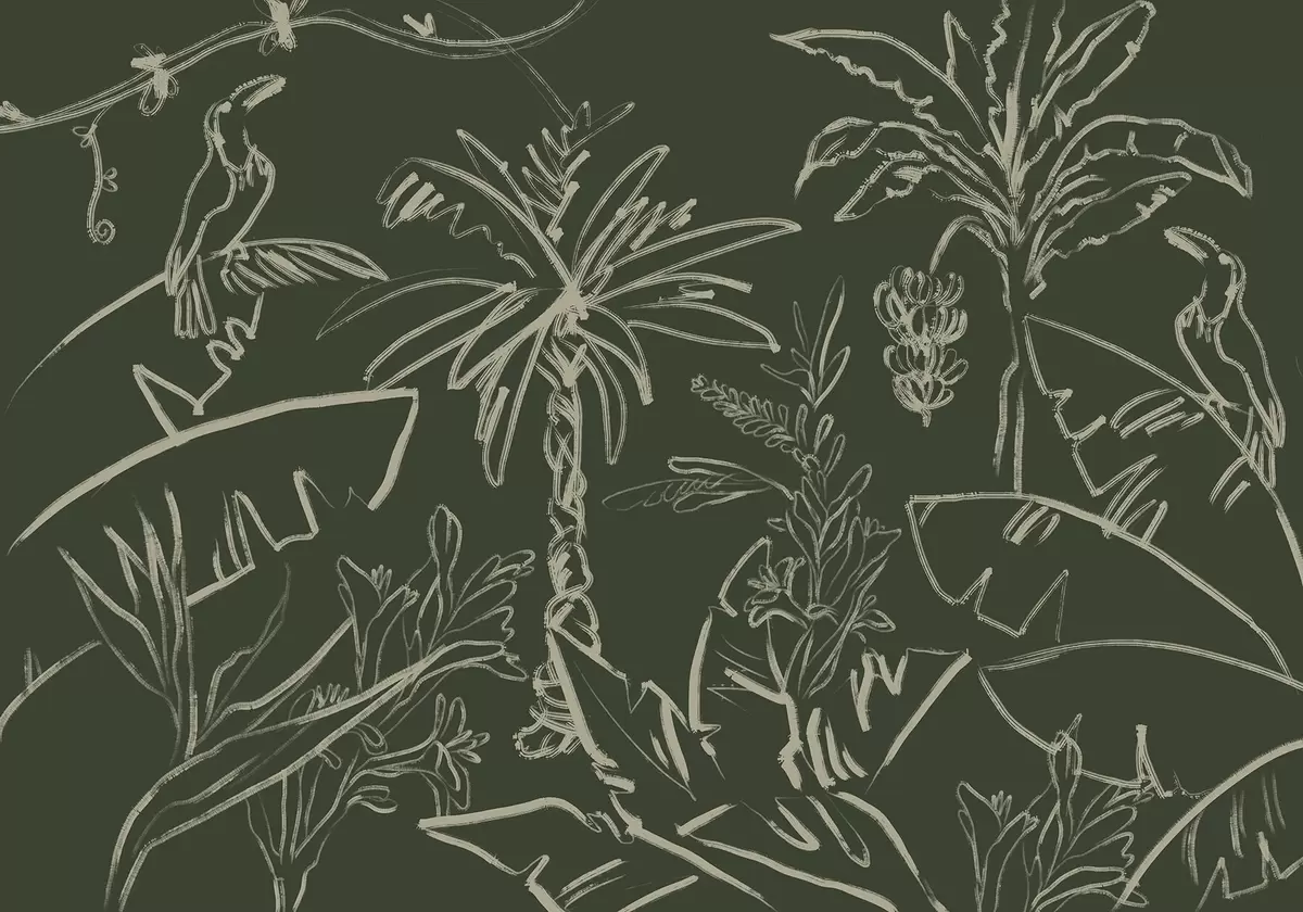 Valokuvatapetti Trooppinen kuvio tummanvihreällä taustalla, palmuja, banaaneja Nr w04020v5