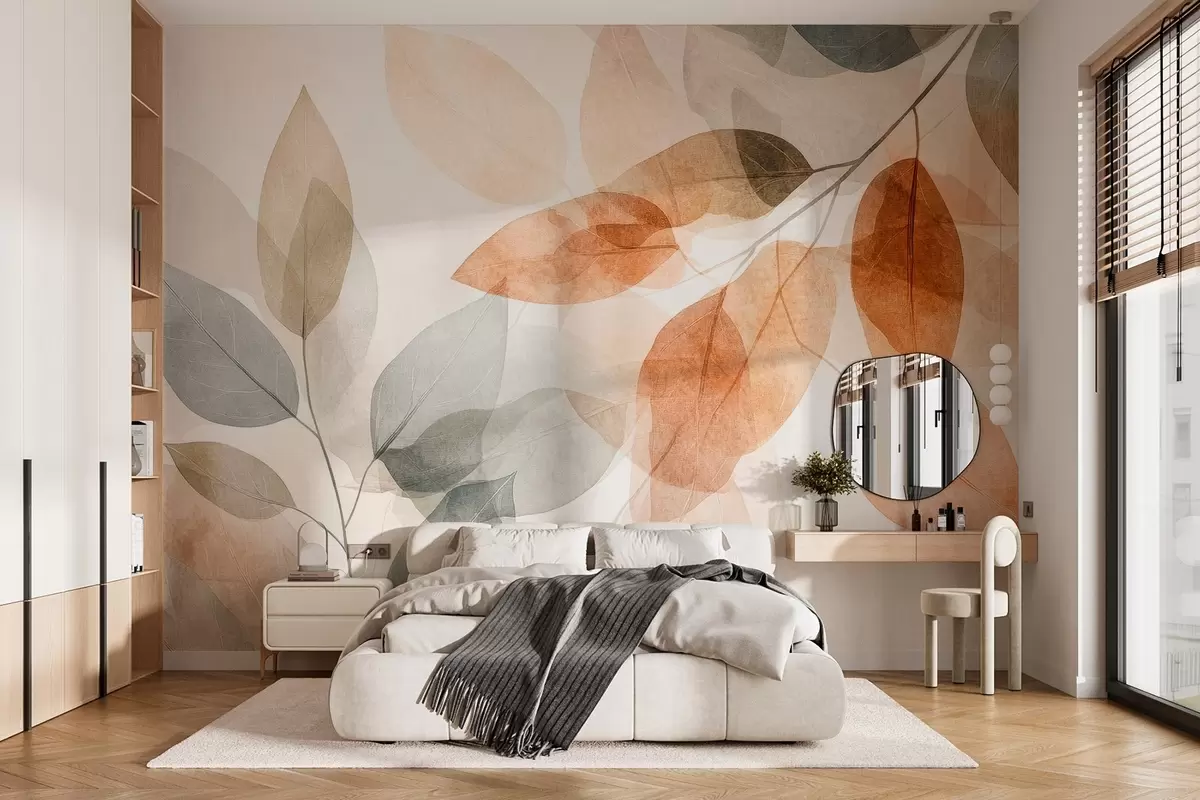 Valokuvatapetti vesivärityylisiä lehtiä seepian ja harmaan sävyissä Nr w04024