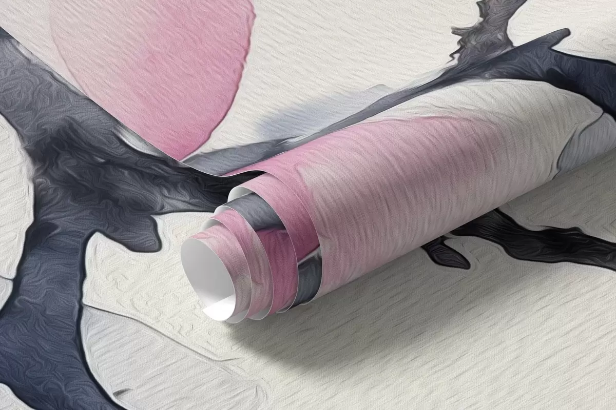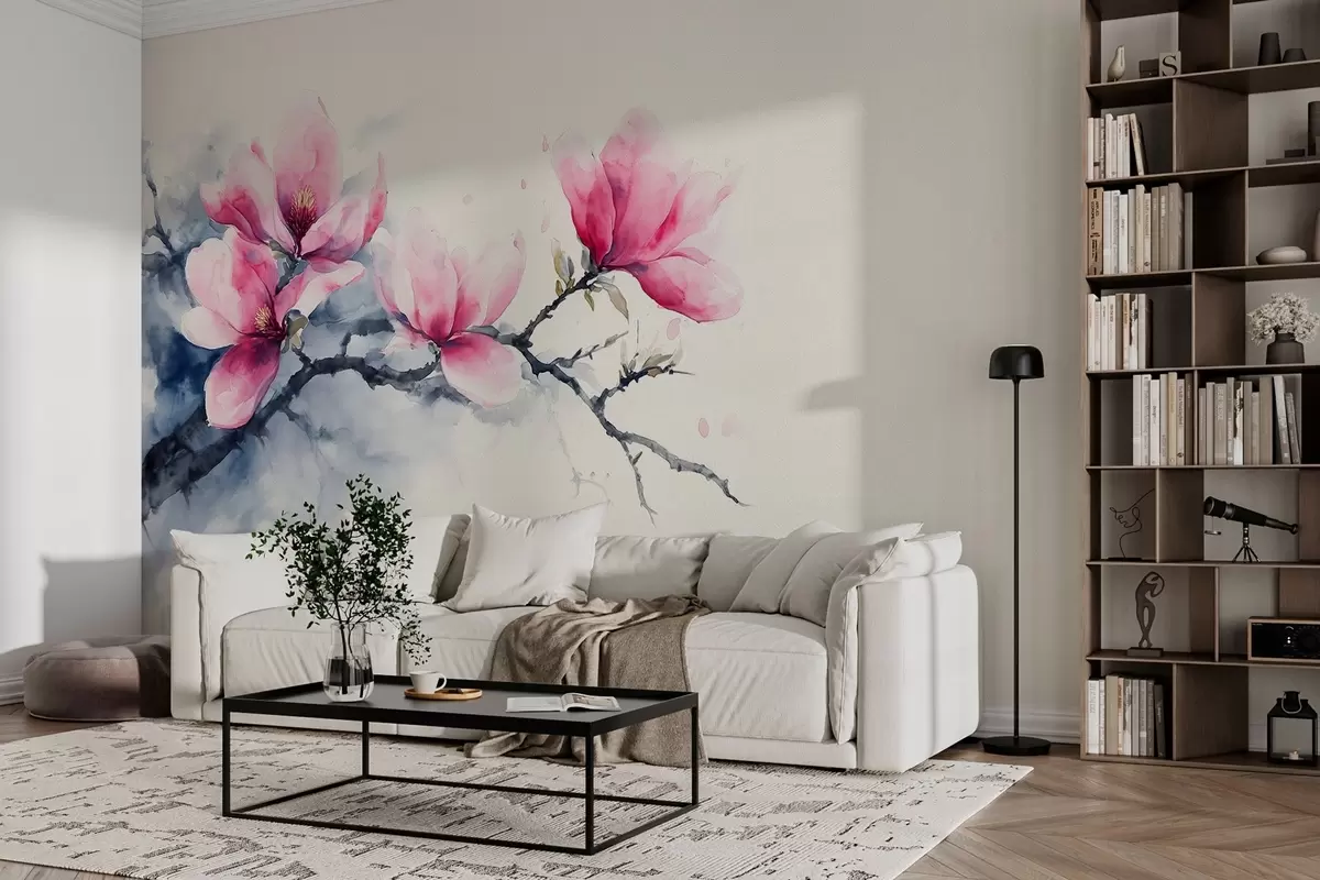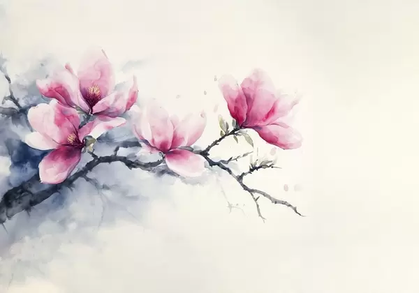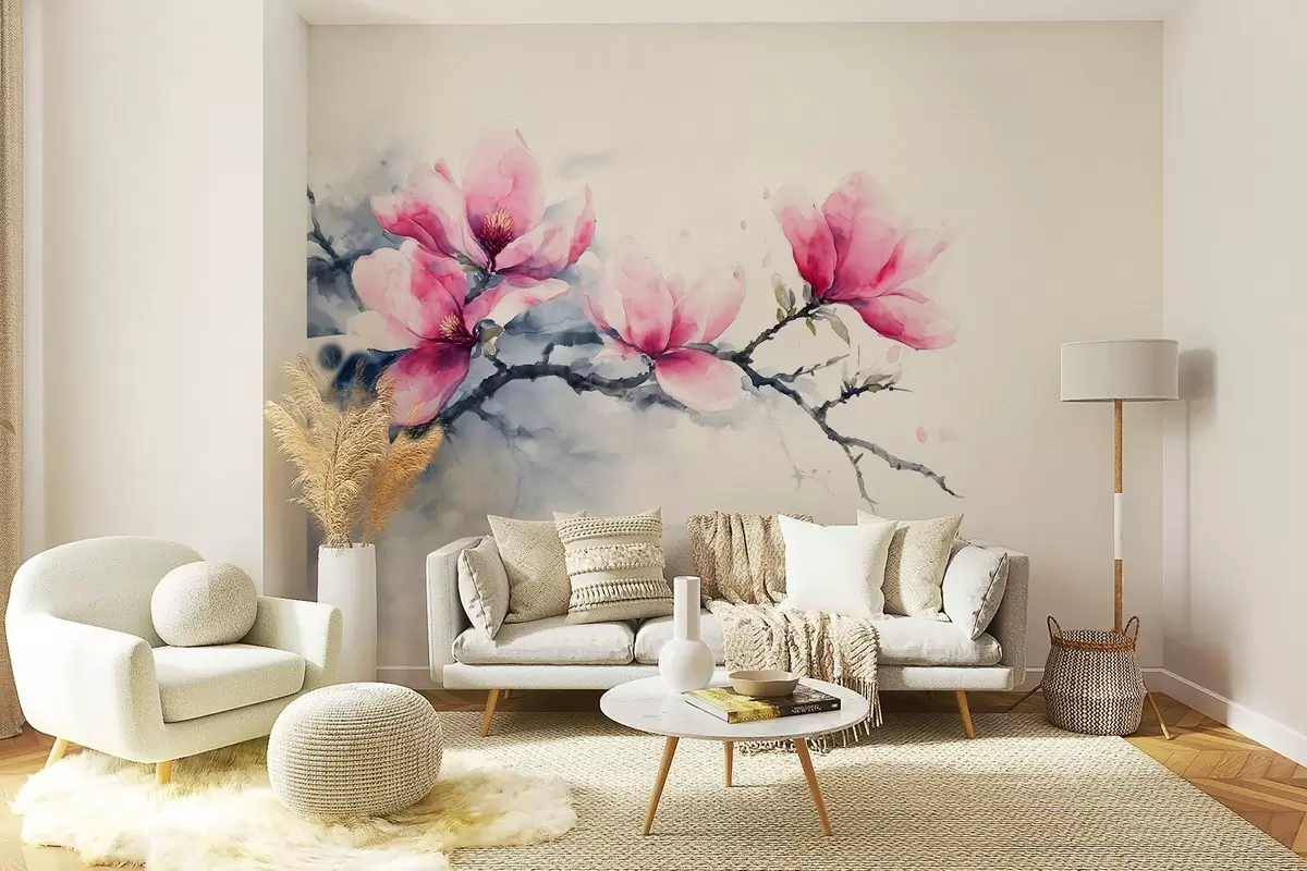 Valokuvatapetti vaaleanpunaisen magnolian kukkiva oksa norsunluun värisellä taustalla Nr w04027