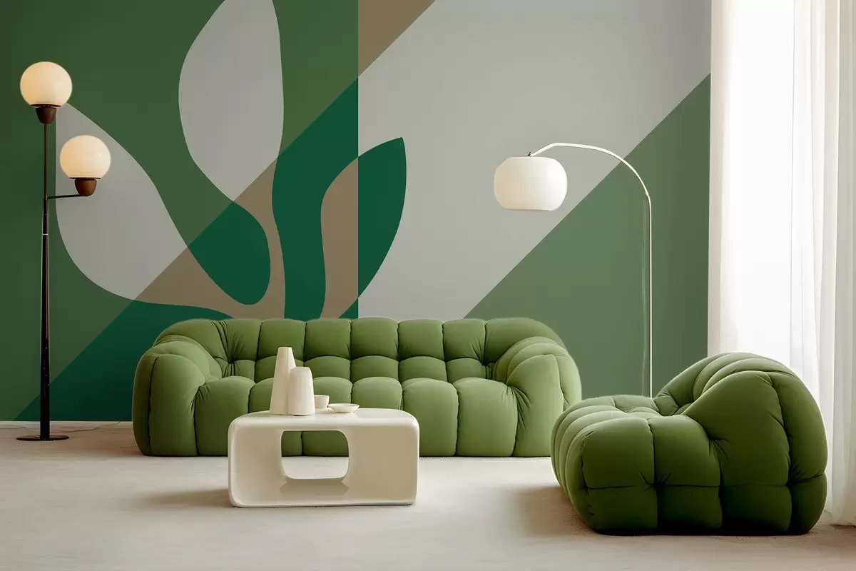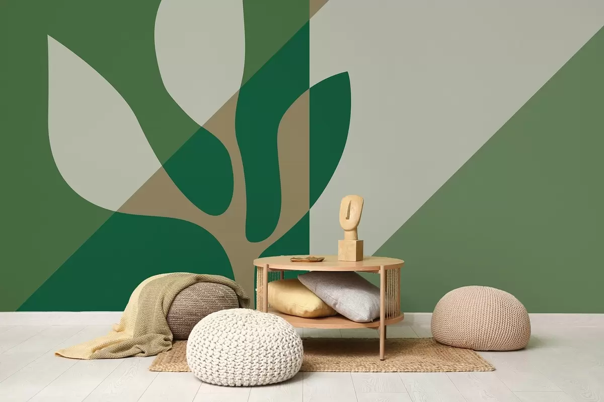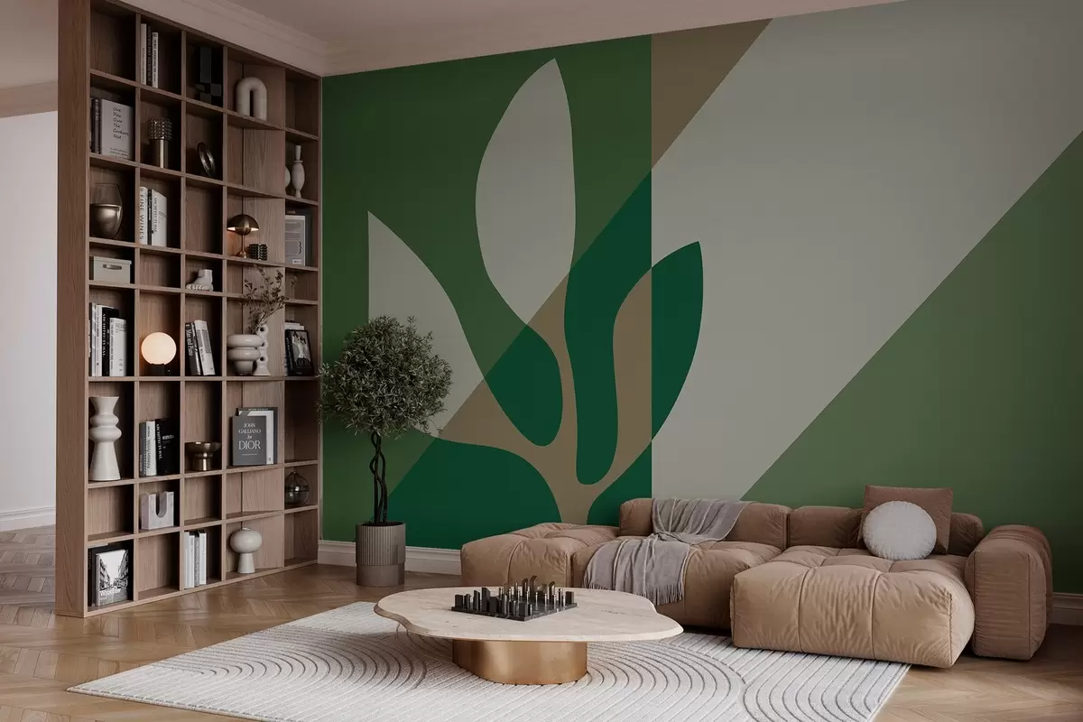 Valokuvatapetti abstrakti graafinen kasvi taustalla geometriaa vihreä ja okra värejä Nr w04028
