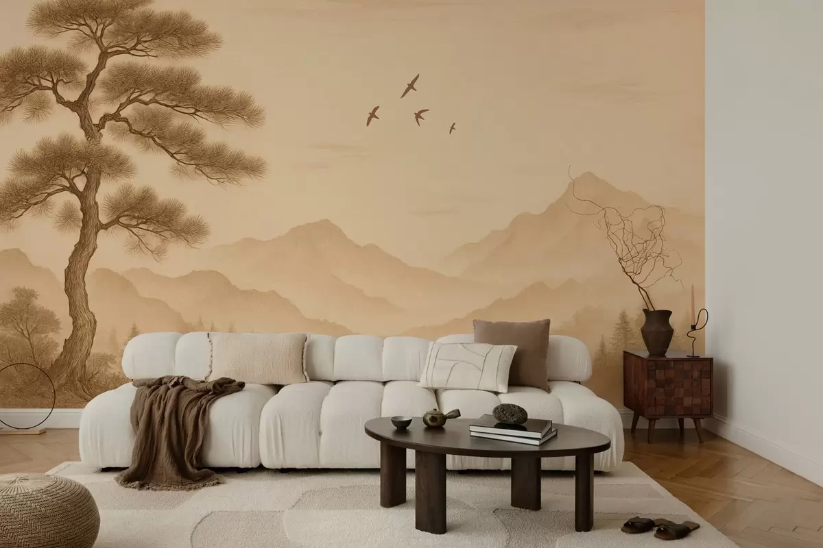 Valokuvatapetti panoraama kukkuloista ja suuresta puusta seepiatyyliin Nr w04033