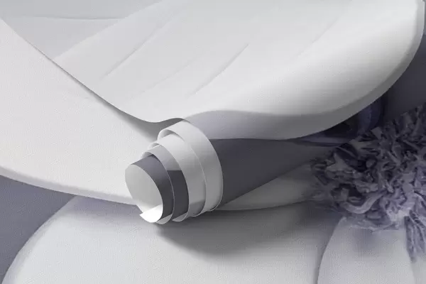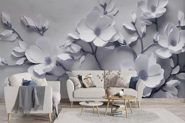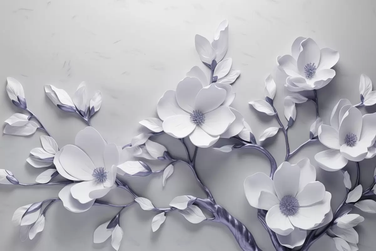 Valokuvatapetti Pehmeän valkoisen ja violetinharmaan sävyinen ulottuvuudellinen kukkakuvio Nr w04039v1