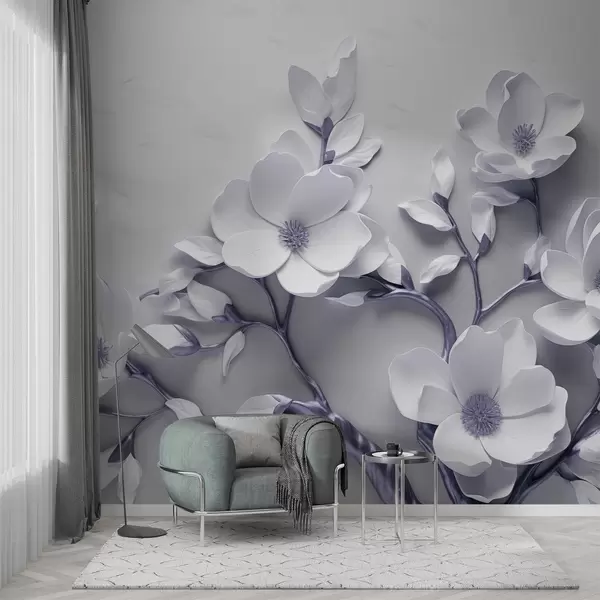 Valokuvatapetti Pehmeän valkoisen ja violetinharmaan sävyinen ulottuvuudellinen kukkakuvio Nr w04039v1