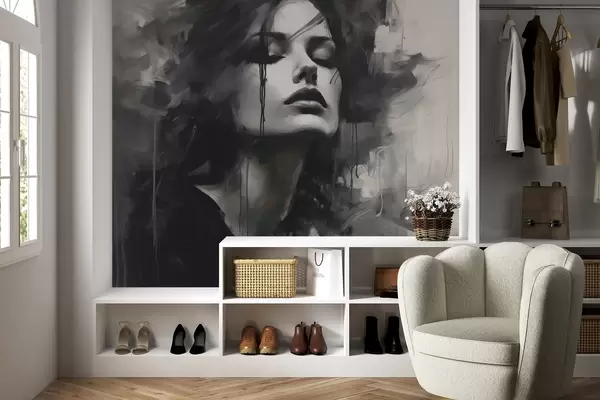 Valokuvatapetti Muotokuva naisesta harmaissa ja mustissa vaatteissa Nr w04049