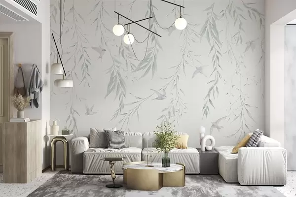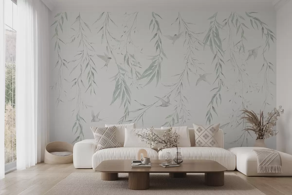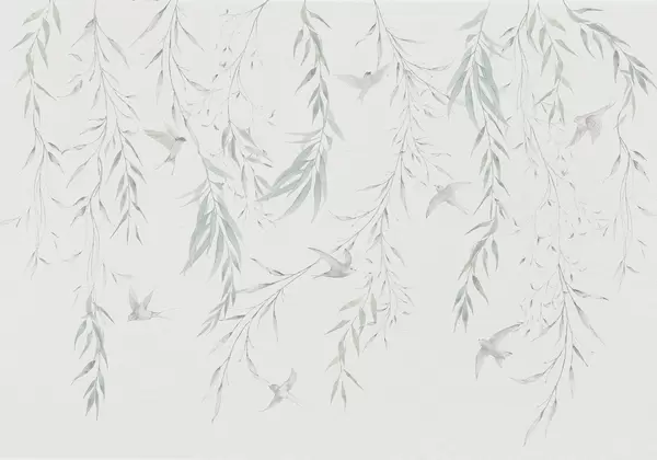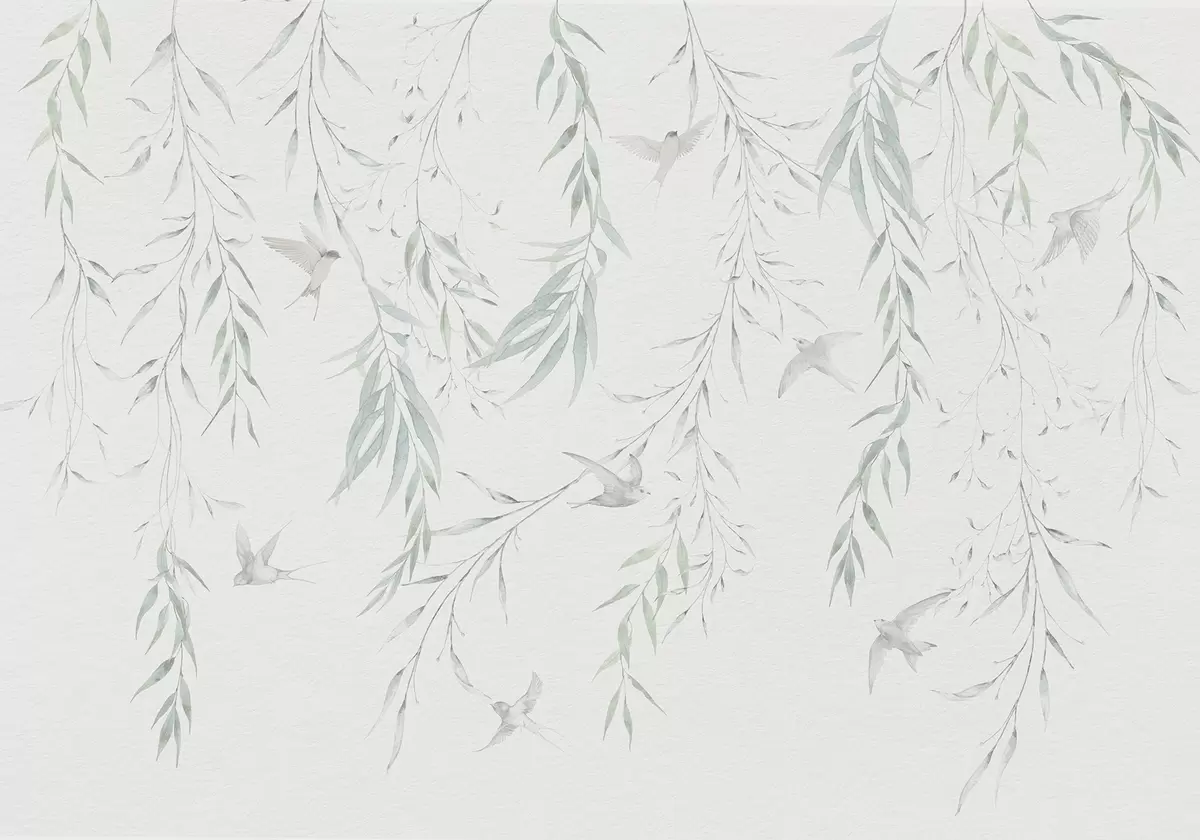 Valokuvatapetti Oksia, joissa roikkuu vihreitä lehtiä ja lintuja Nr w04052