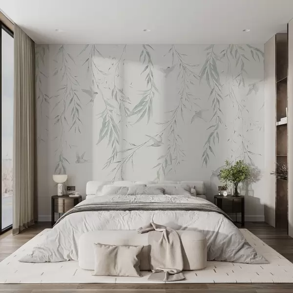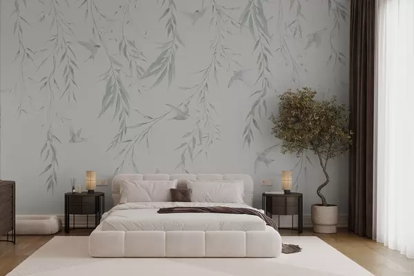 Valokuvatapetti Oksia, joissa roikkuu vihreitä lehtiä ja lintuja Nr w04052