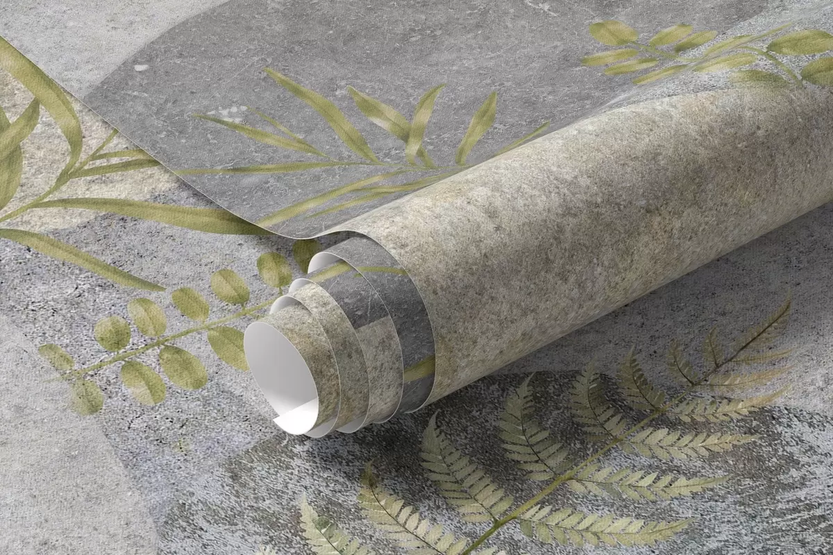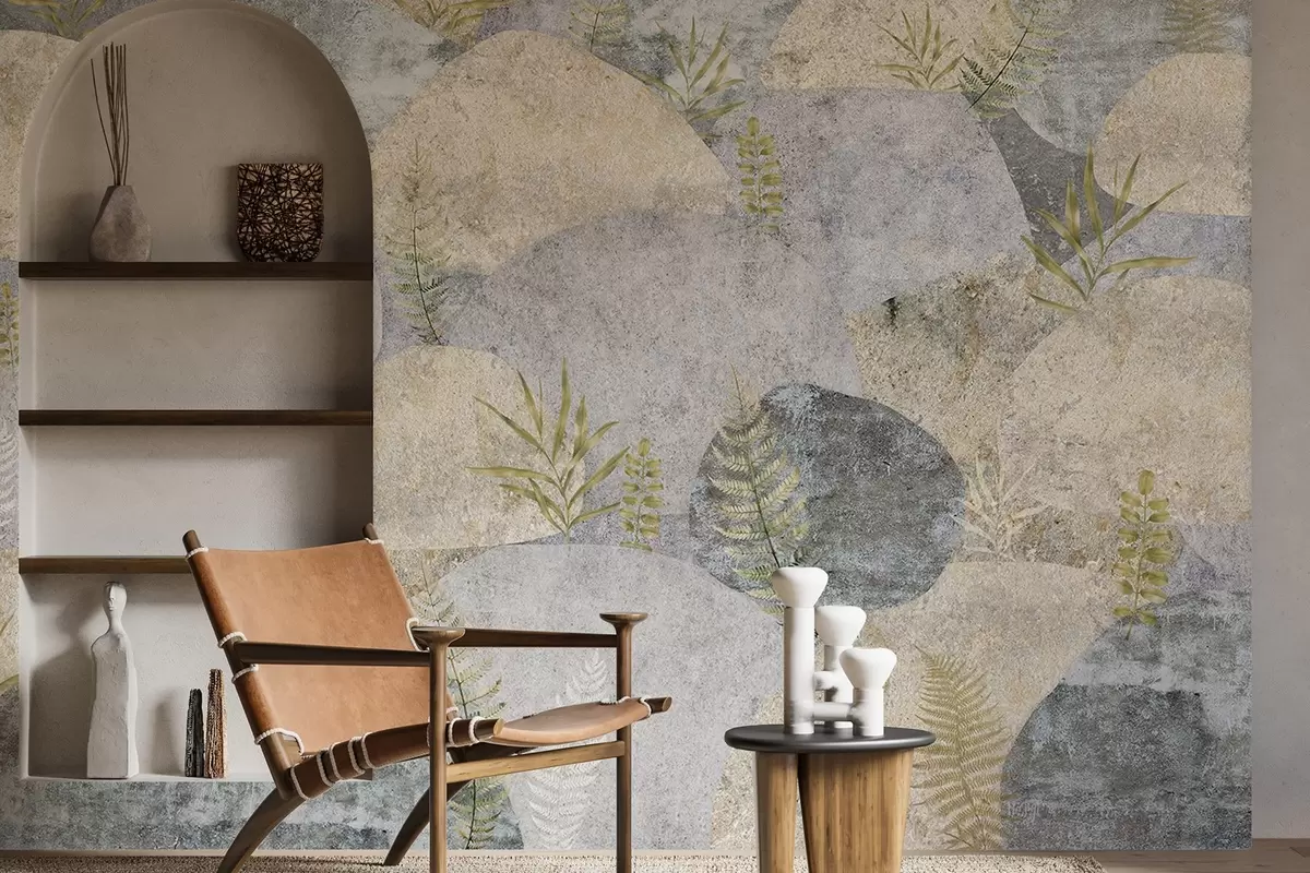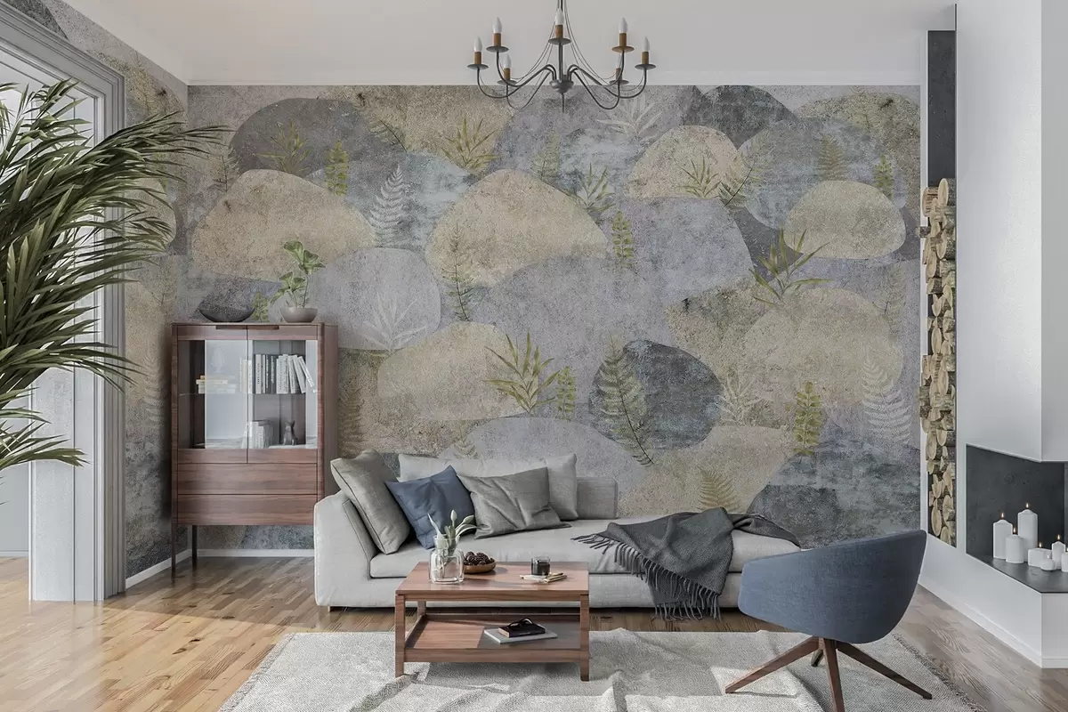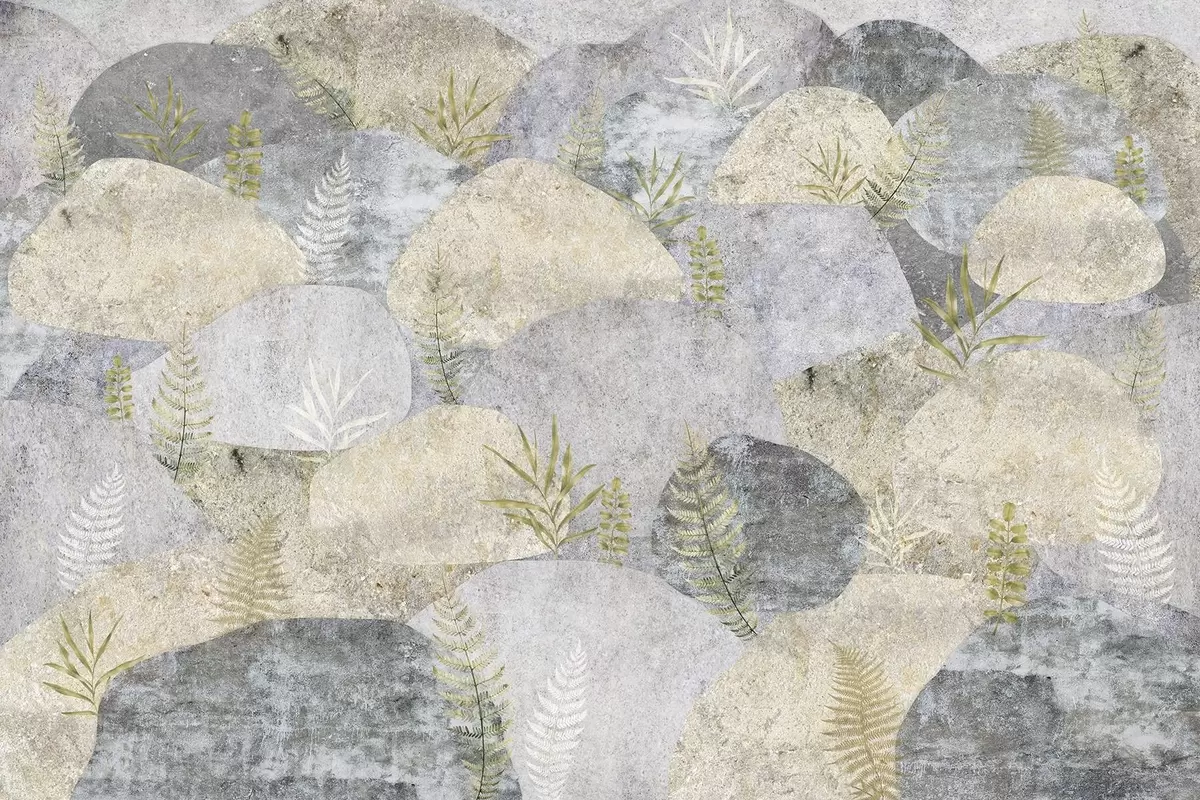 Valokuvatapetti Kivet kasveilla, saniainen, pohjoismainen, maalaismainen tyyli, harmaa ja hiekka värit Nr w04064