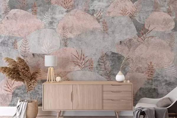 Valokuvatapetti Kivet kasveilla, saniainen, pohjoismainen, maalaismainen tyyli, harmaat ja vaaleanpunaiset värit Nr w04064v1