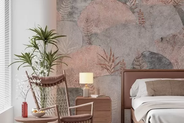 Valokuvatapetti Kivet kasveilla, saniainen, pohjoismainen, maalaismainen tyyli, harmaat ja vaaleanpunaiset värit Nr w04064v1