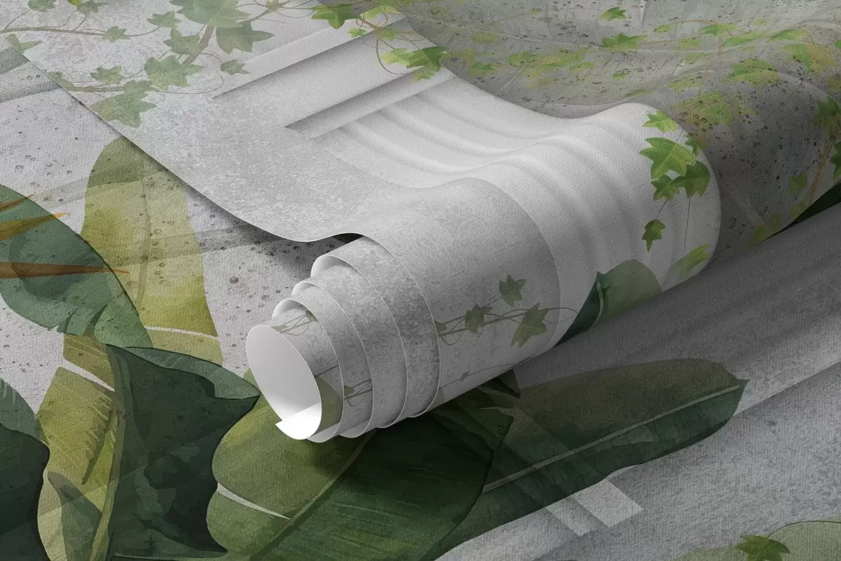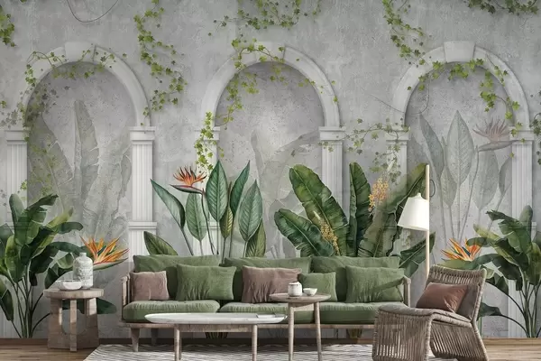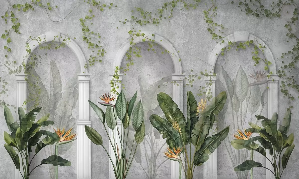 Valokuvatapetti Betoniseinä, jossa kaaria ja trooppisia kasveja, kukka, luonnolliset värit Nr w04065