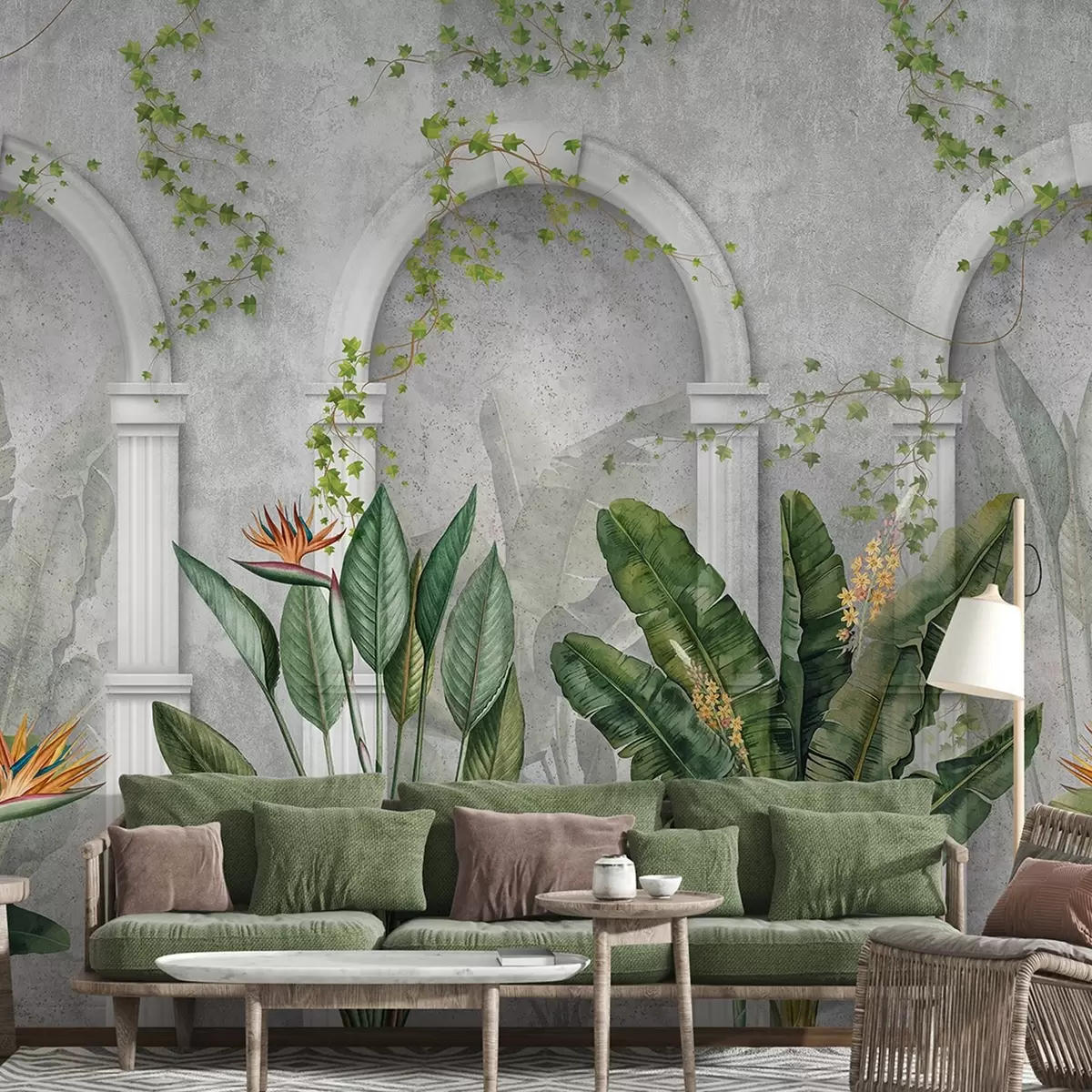Valokuvatapetti Betoniseinä, jossa kaaria ja trooppisia kasveja, kukka, luonnolliset värit Nr w04065