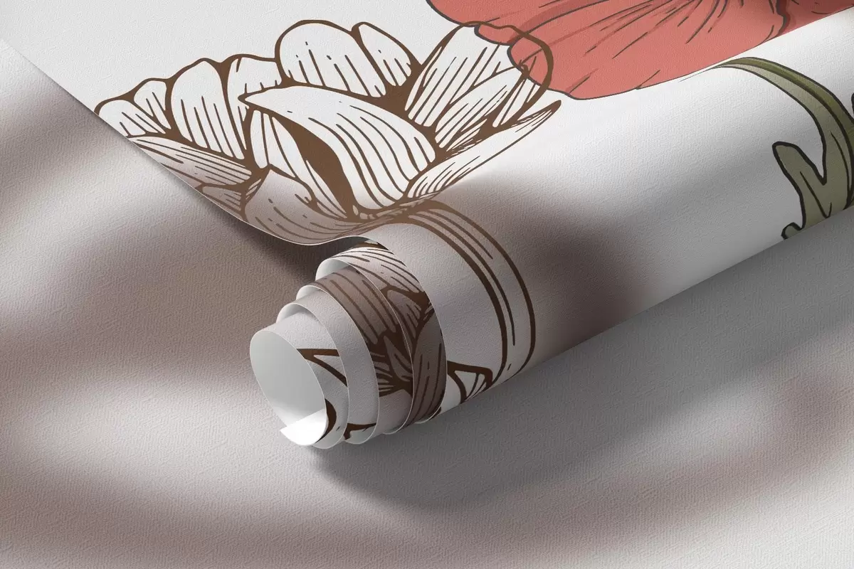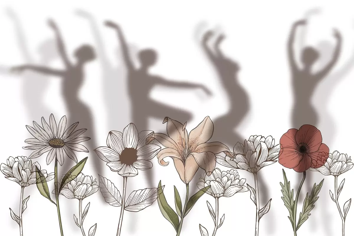 Valokuvatapetti Balleriinojen siluetteja, maalaismaisia kukkia, viivataidetta, punaisia ja beigejä värejä Nr w04069