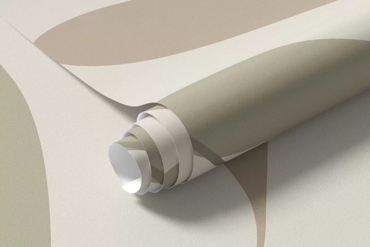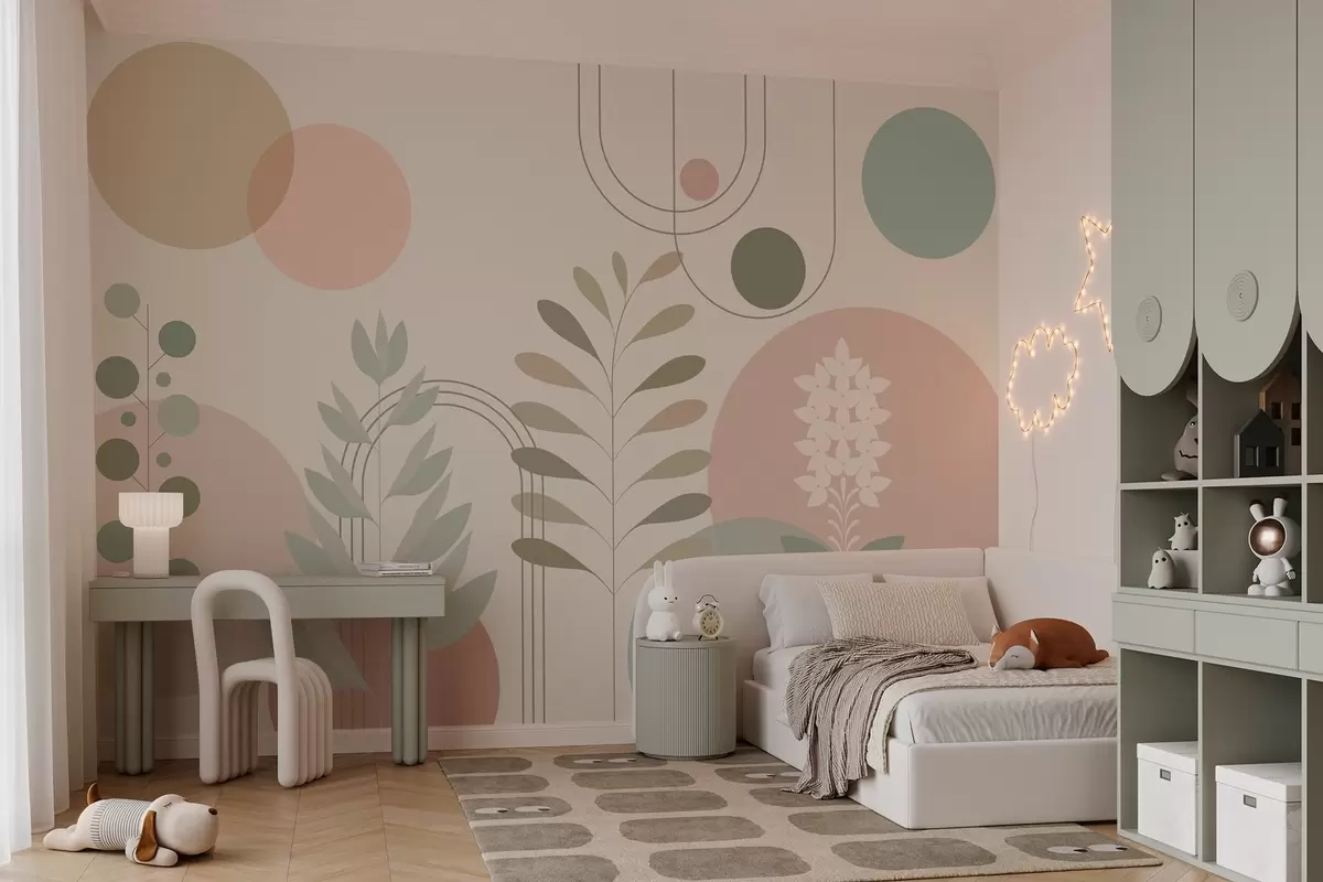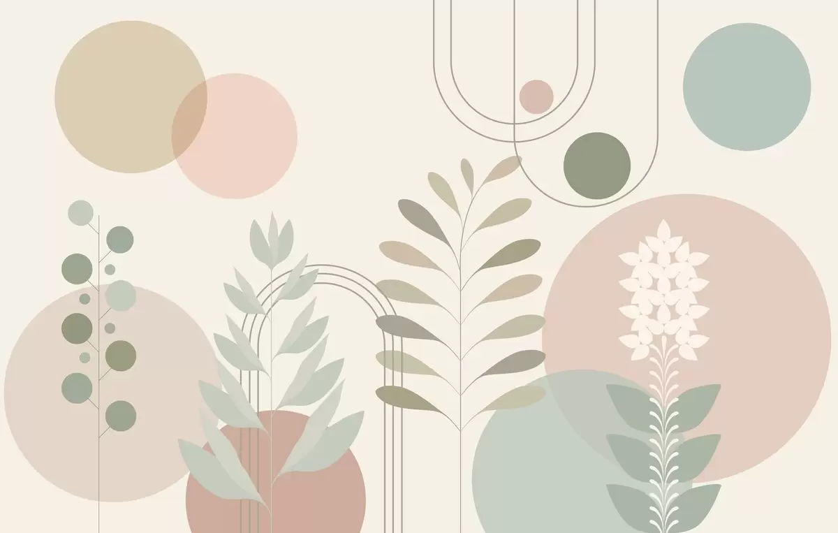 Valokuvatapetti geometrinen abstraktio, jossa ympyröitä ja tyyliteltyjä kasveja kermanvärisellä pohjalla Nr w04070