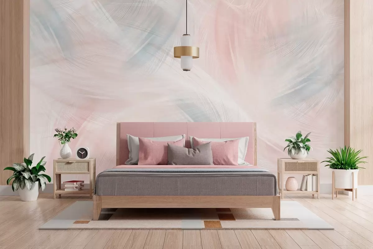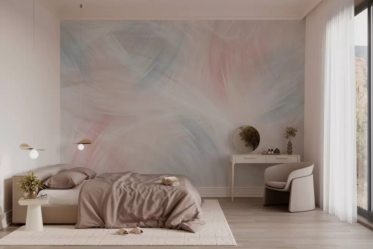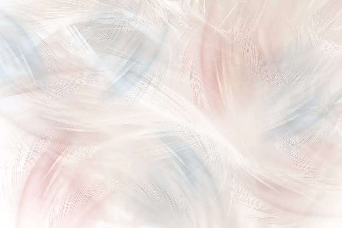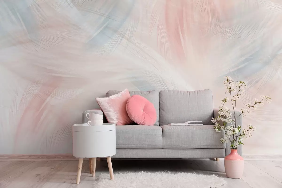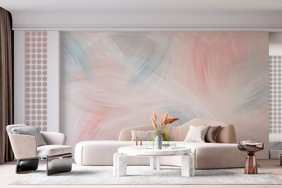 Valokuvatapetti ilmavia höyheniä vaaleanpunaisen ja sinisen sävyissä Nr w04071