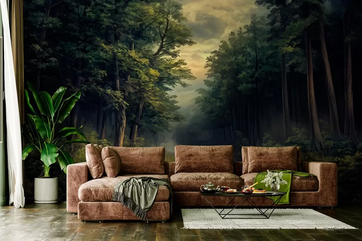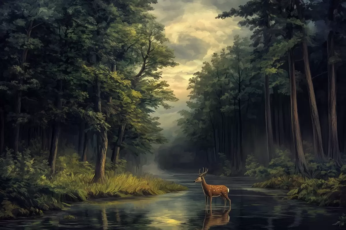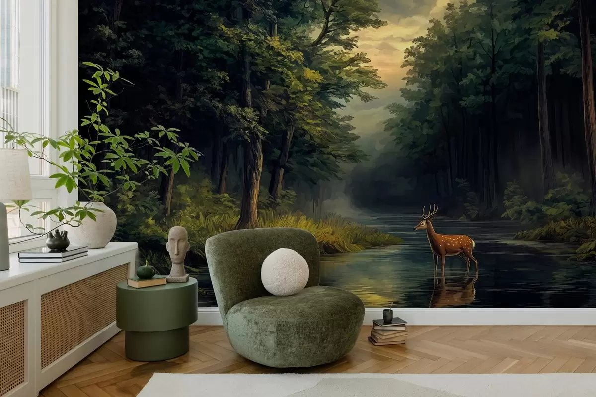 Valokuvatapetti Metsä, jossa on peuroja ja joki hollantilaisen öljymaalauksen tyyliin Nr w04072