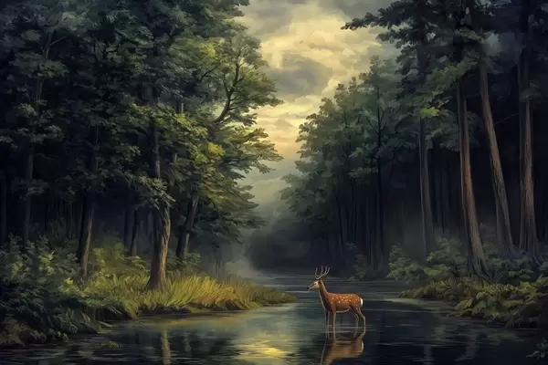 Valokuvatapetti Metsä, jossa on peuroja ja joki hollantilaisen öljymaalauksen tyyliin w04072