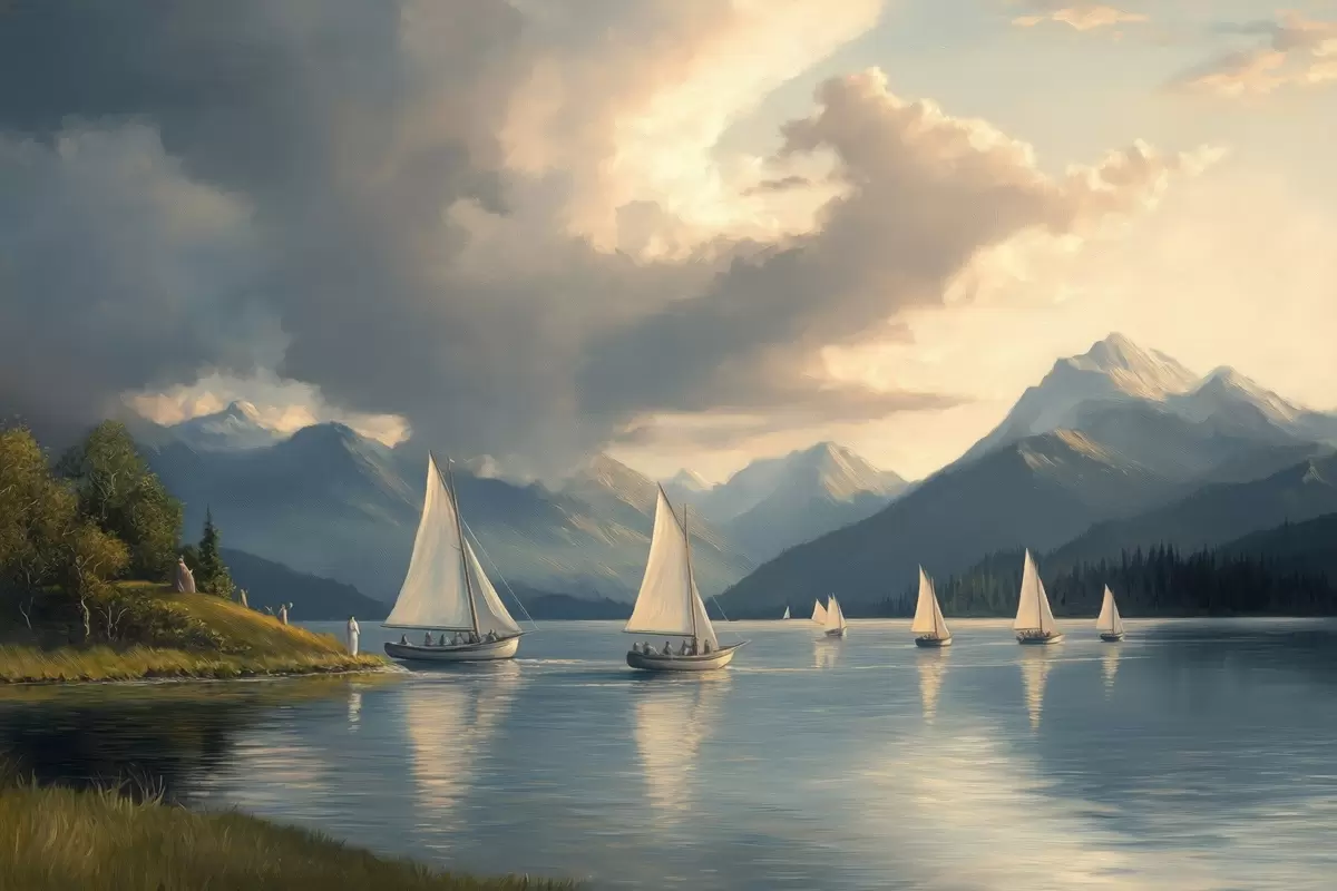 Valokuvatapetti regatta järvellä pilvisellä taivaalla 1800-luvun öljymaalauksen tyyliin Nr w04076