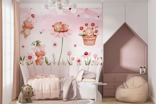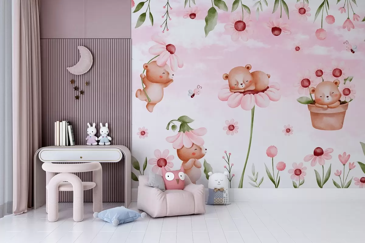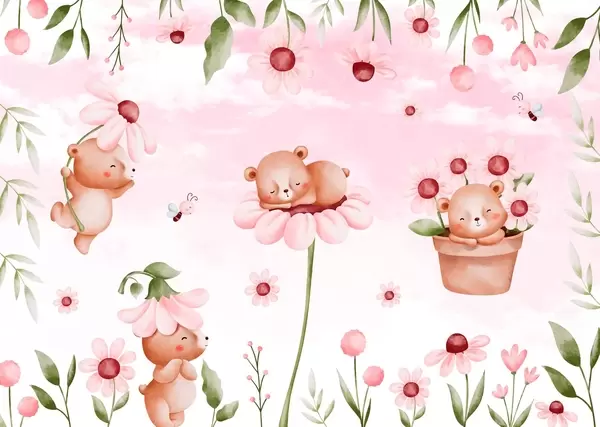 Valokuvatapetti Karhut kukkien kanssa, satueläimet Nr w04143