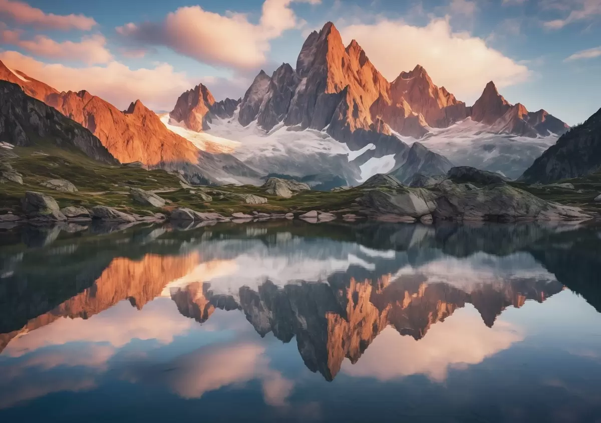 Valokuvatapetti Vuoret aamunkoitteessa, heijastus vedessä, realistinen maisema Nr w04150