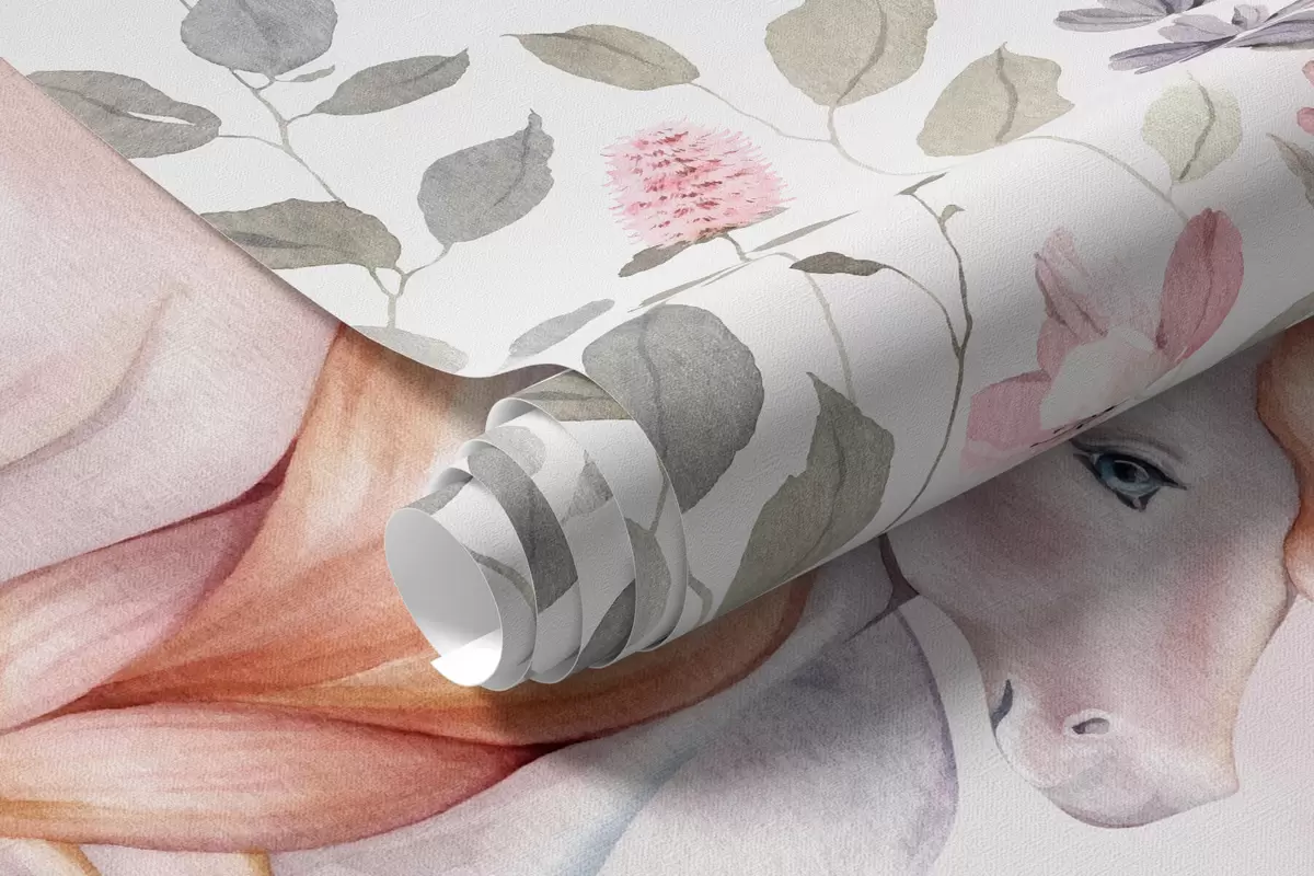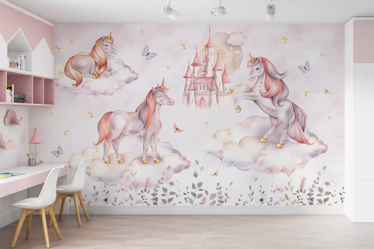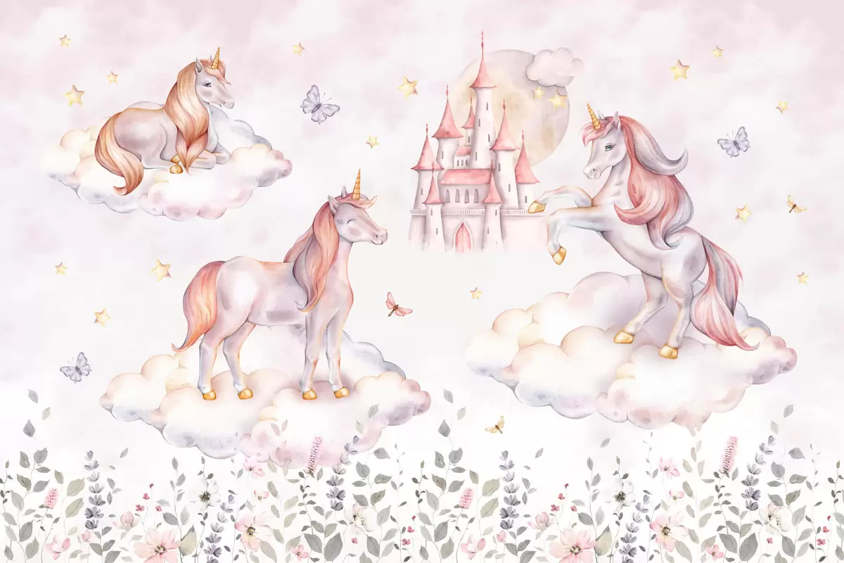 Valokuvatapetti Yksisarvisia pilvissä tähtien, perhosten ja kukkien kanssa Nr w04165