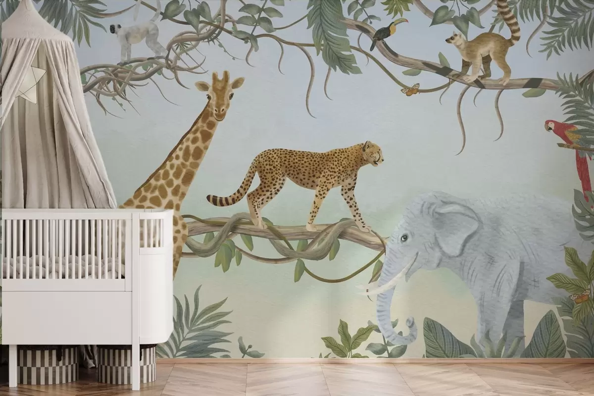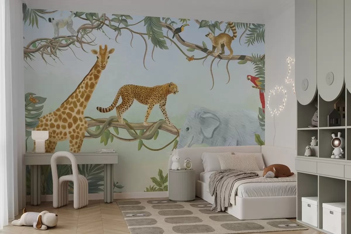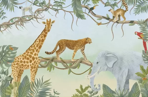 Valokuvatapetti Viidakkokuvitus, jossa kirahvi, gepardi ja norsu Nr w04194