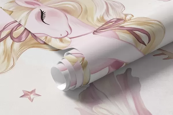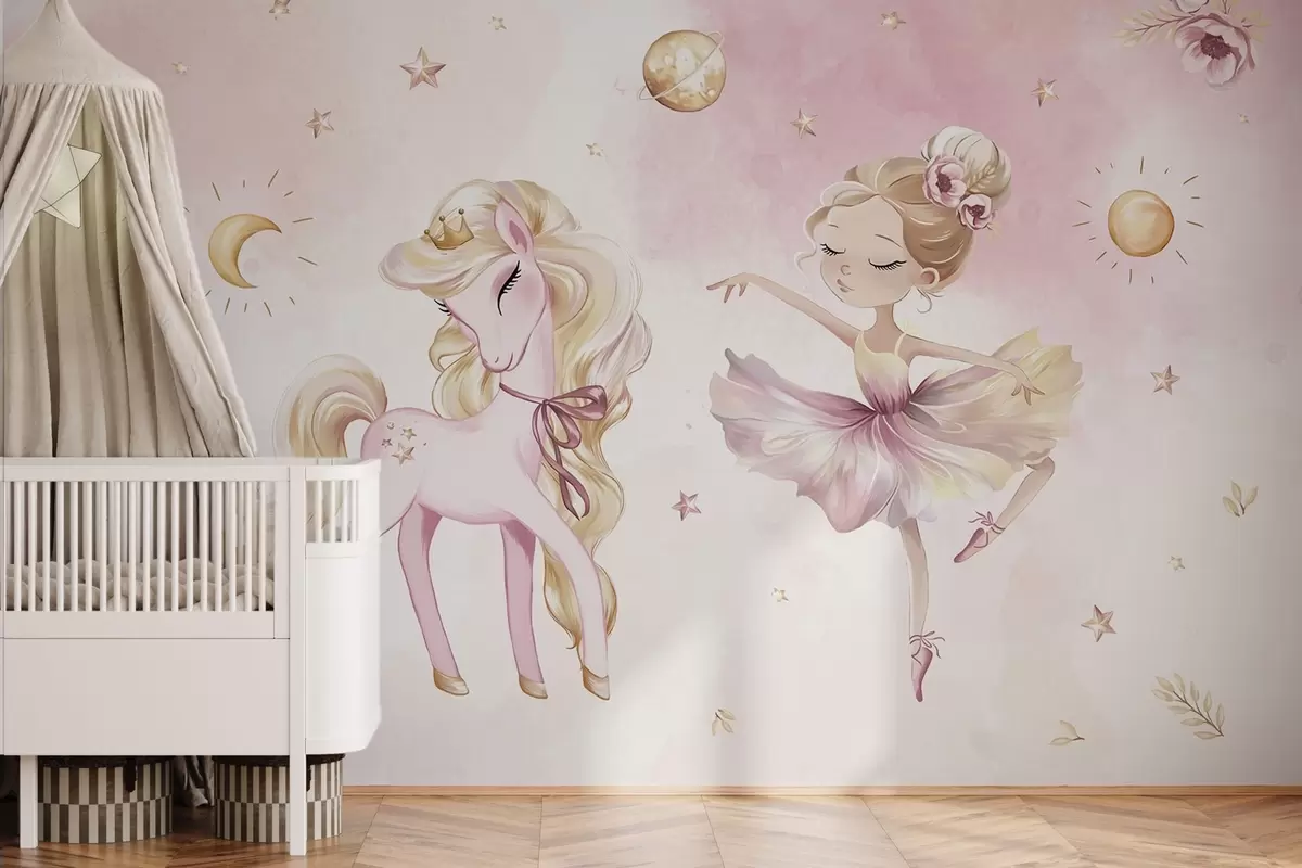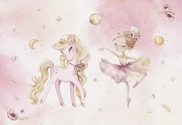 Valokuvatapetti Yksisarvinen ja ballerina vaaleanpunaisessa sadussa, lasten satu Nr w04196