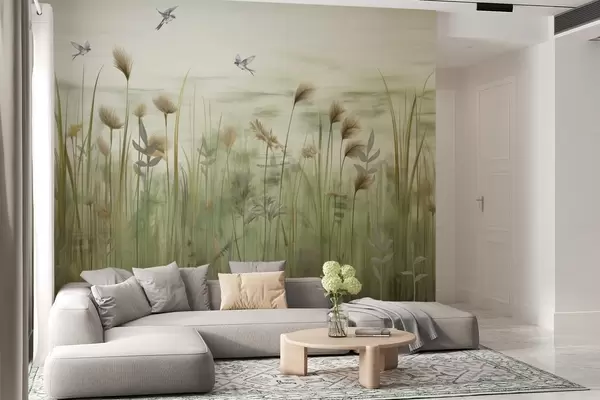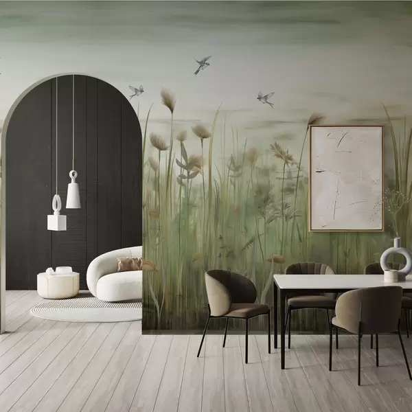 Valokuvatapetti Ruohomaisema pääskyjen kanssa pehmeää taivasta vasten Nr w04258v1