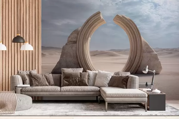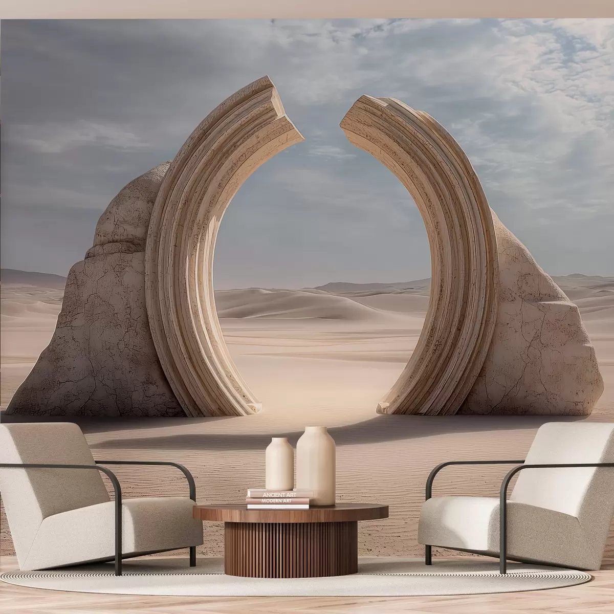 Valokuvatapetti surrealistinen aavikkomaisema, jossa suuri arkkitehtoninen kaari Nr w04284
